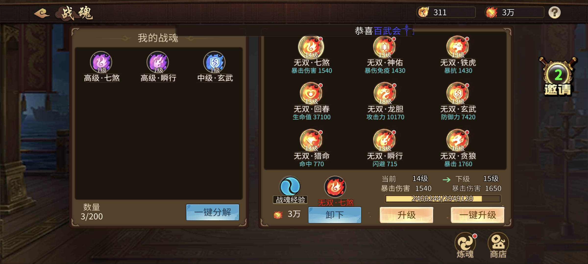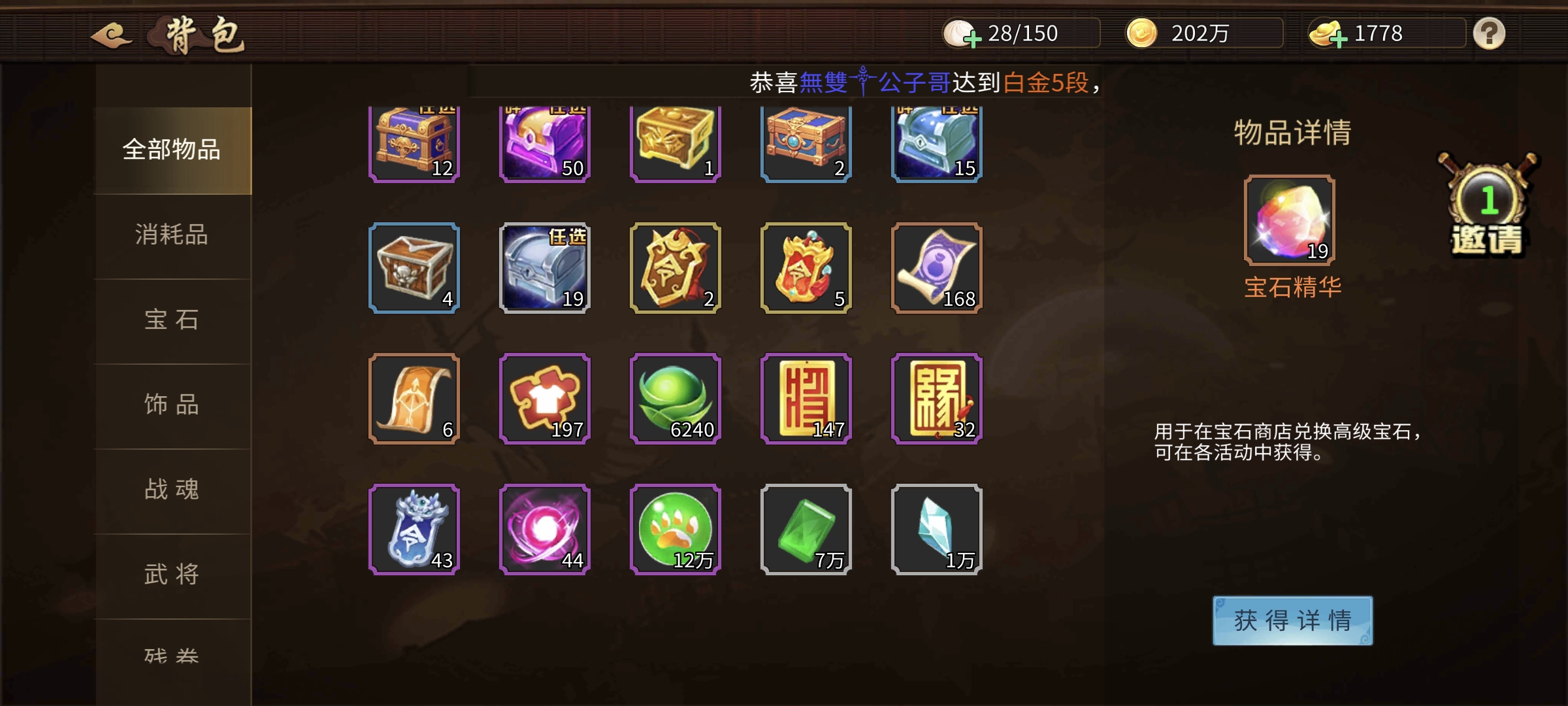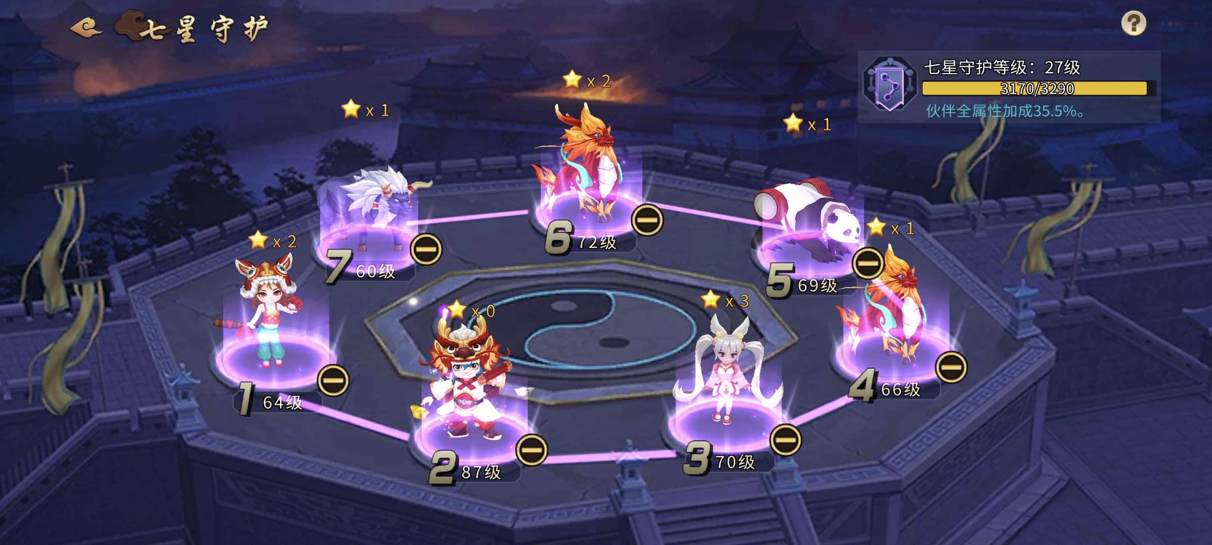 以前区榜2,合区后不想玩了。164级,天书76666,冰书马上升7,8星刘协。宠物援军优秀。