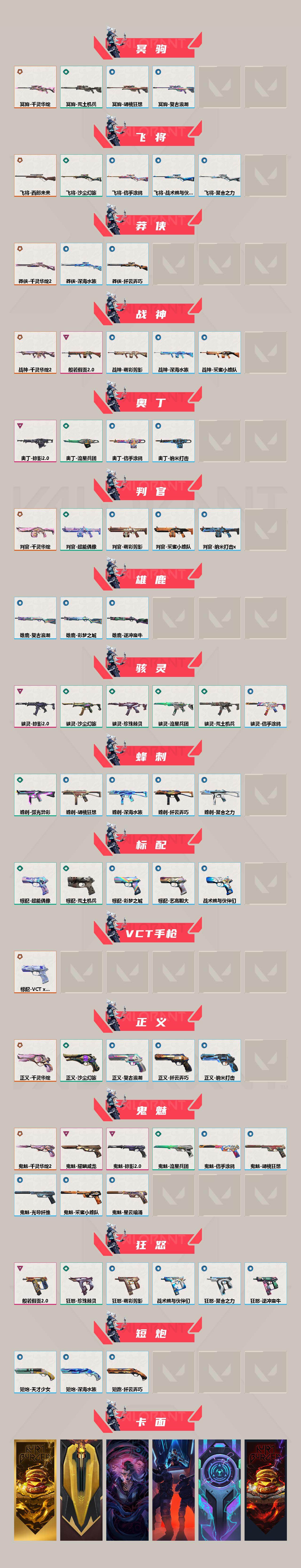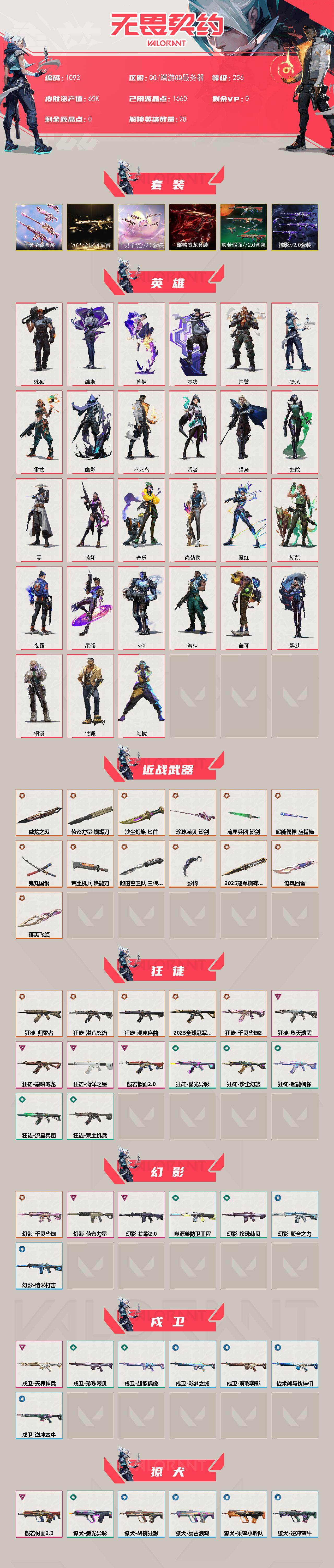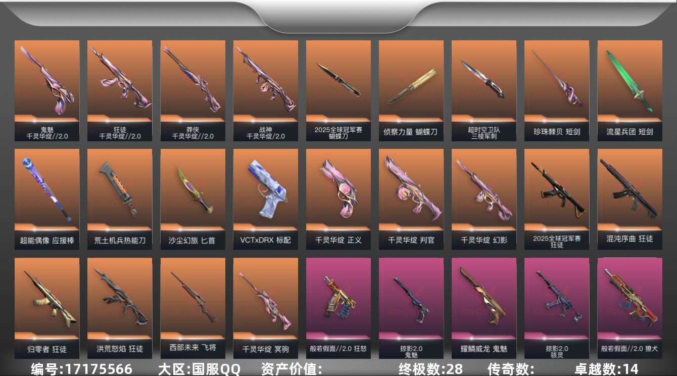 【套装】:2025全球冠军赛套装,千灵华绽//2.0套装,千灵华绽套装,般若假面//2.0套装,耀鳞威龙套装,掠影//2.0套装【英雄】:幻棱,炼狱,维斯,暮蝶,钛狐,壹决,铁臂,捷风,雷兹,幽影,不死鸟,贤者,猎枭,蝰蛇,零,芮娜,奇乐,尚勃勒,霓虹,斯凯,夜露,星礈,K/O,海神,盖可,黑梦,钢锁【近战武器】:近战武器-2025全球冠军赛 蝴蝶刀,近战武器-流风回雪,近战武器-影钩,近战武器-超时空卫队 三棱军刺,近战武器-侦察力量 蝴蝶刀,近战武器-落英飞旋,近战武器-威龙之刃,近战武器-