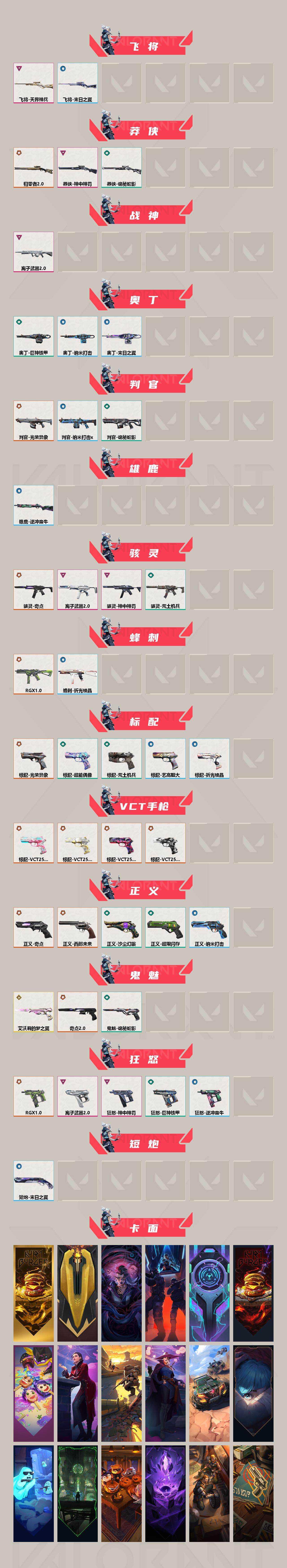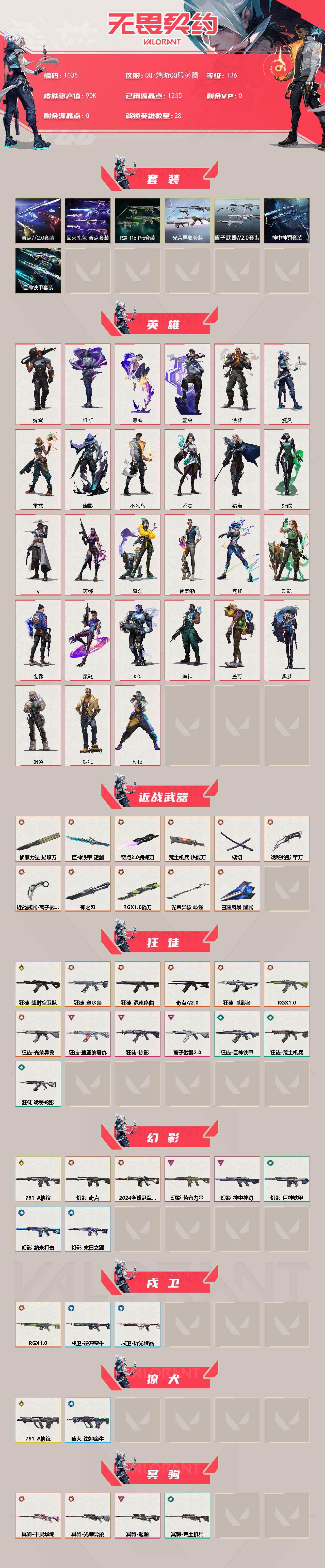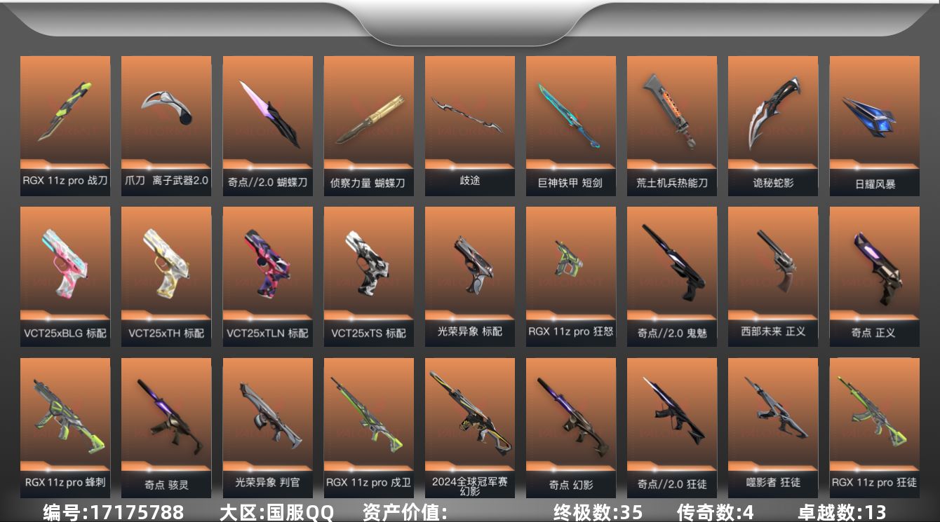 【套装】:光荣异象套装,RGX 11z Pro套装,奇点//2.0套装,回火礼包:奇点套装,离子武器//2.0套装,神中神罚套装,巨神铁甲套装【英雄】:幻棱,炼狱,维斯,暮蝶,钛狐,壹决,铁臂,捷风,雷兹,幽影,不死鸟,贤者,猎枭,蝰蛇,零,芮娜,奇乐,尚勃勒,霓虹,斯凯,夜露,星礈,K/O,海神,盖可,黑梦,钢锁【近战武器】:近战武器-光荣异象 歧途,近战武器-RGX 11z Pro 战刀,近战武器-神之刃,近战武器-侦察力量 蝴蝶刀,近战武器-奇点//2.0 蝴蝶刀,近战武器-镭切,近战武器
