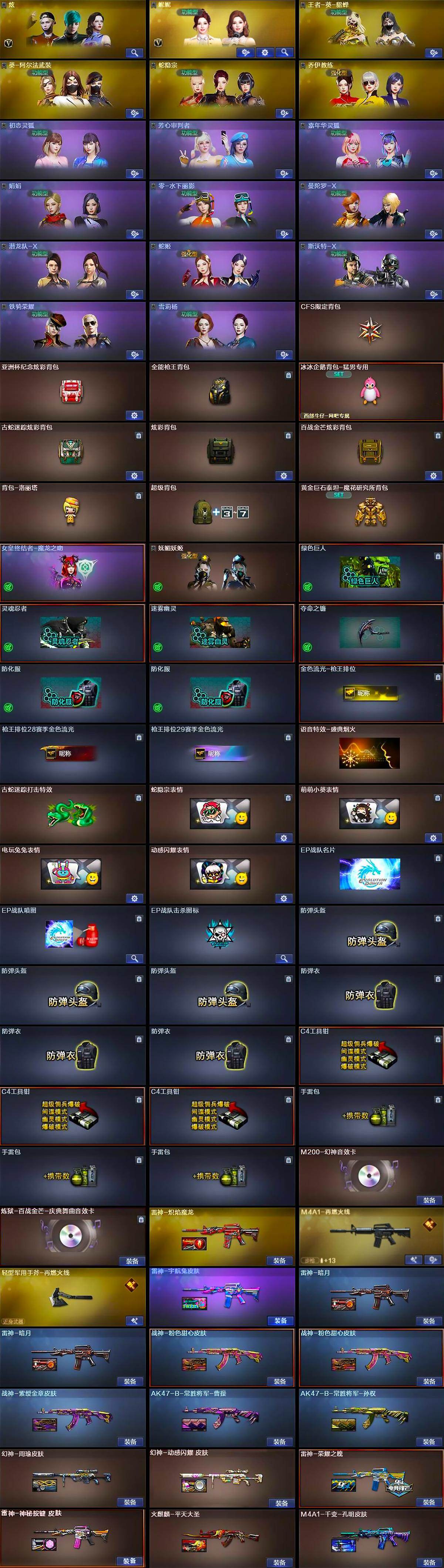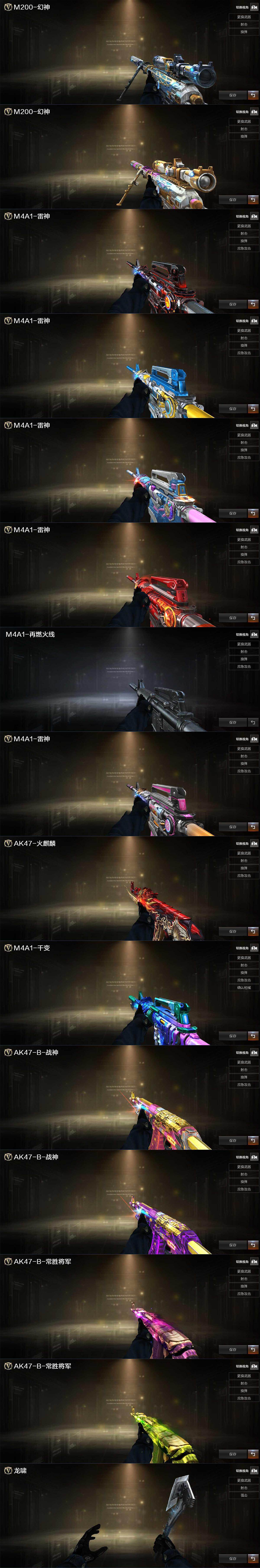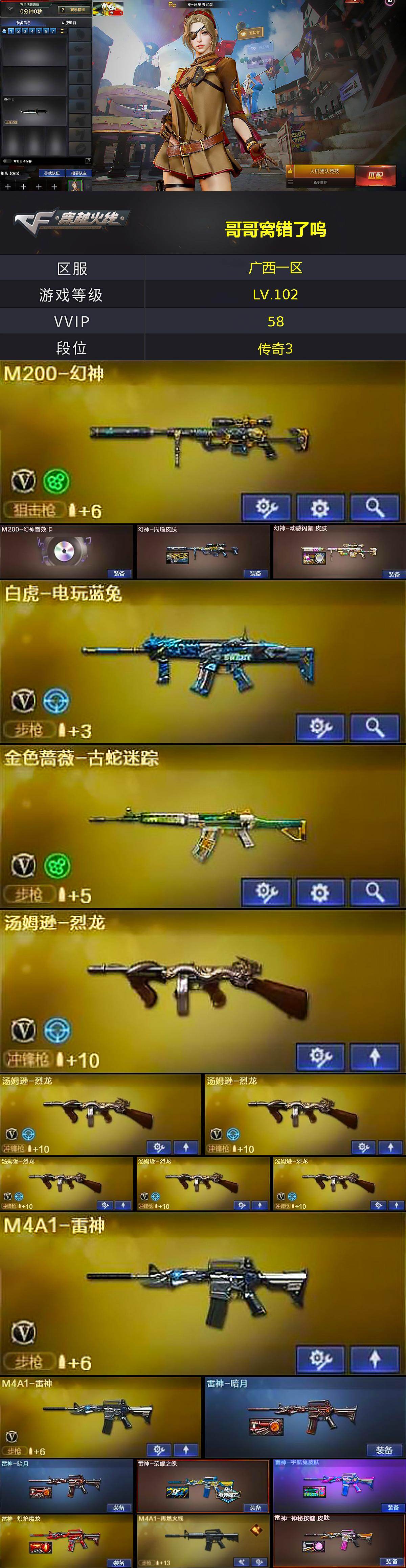广西一区-56V-3王者武器数-0炫金武器数【热门武器】:M200-幻神,金色蔷薇-古蛇迷踪,修罗-古蛇迷踪,白虎-电玩蓝兔,M4A1-黑骑士,汤姆逊-烈龙*6,金色蔷薇-空【王者炫金武器】:王者青龙,王者之啸【音效卡】:M200-幻神音效卡,炼狱-百战金芒-庆典舞曲音效卡【皮肤】:幻神-周瑜皮肤,幻神-动感闪耀 皮肤,雷神-暗月*2,雷神-荣耀之魄,雷神-宇航兔皮肤,雷神-炽焰魔龙,M4A1-再燃火线,雷神-神秘按键 皮肤,火麒麟-平天大圣,M4A1-千变-孔明皮肤,战神-粉色甜心皮肤*2,战