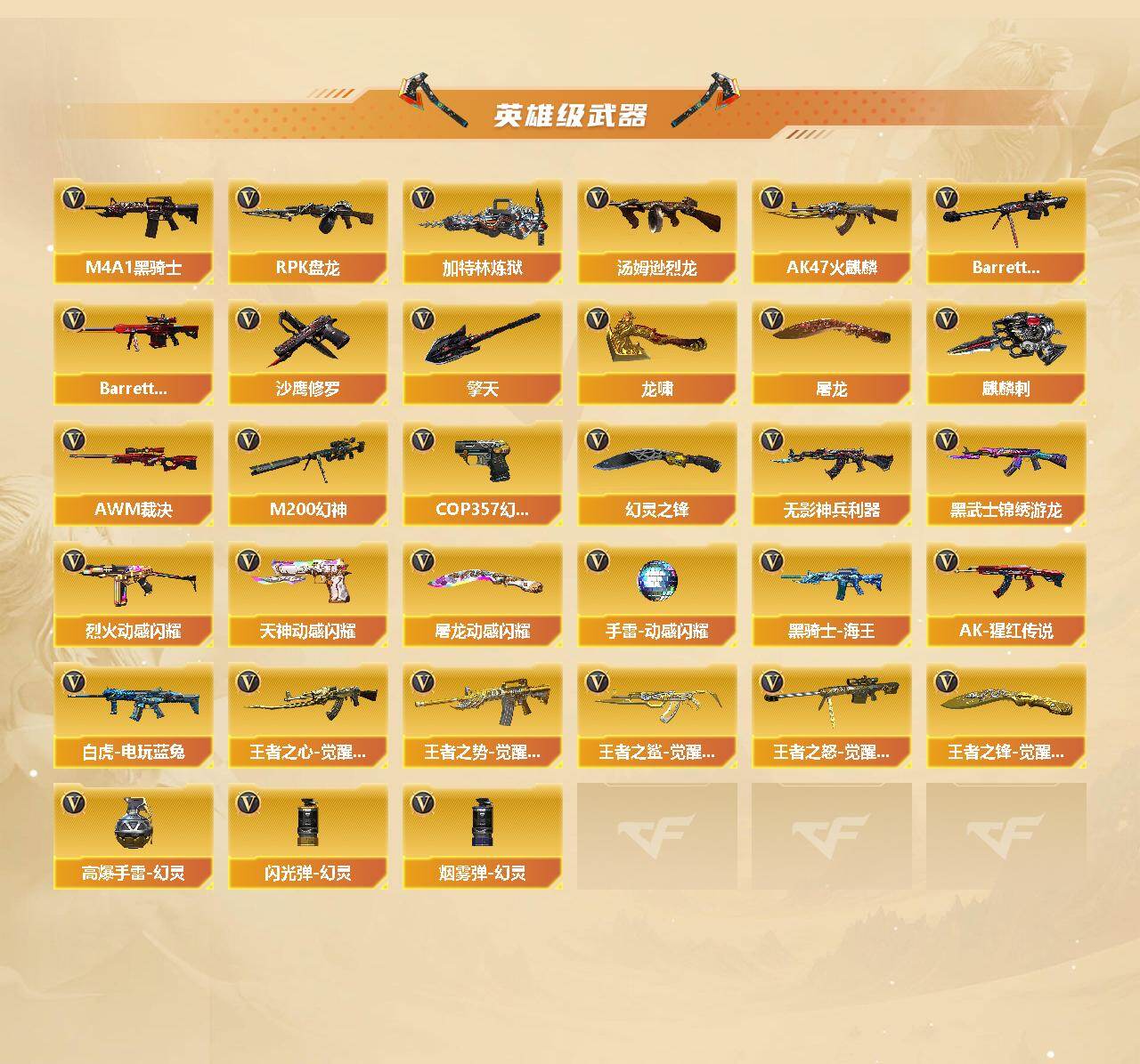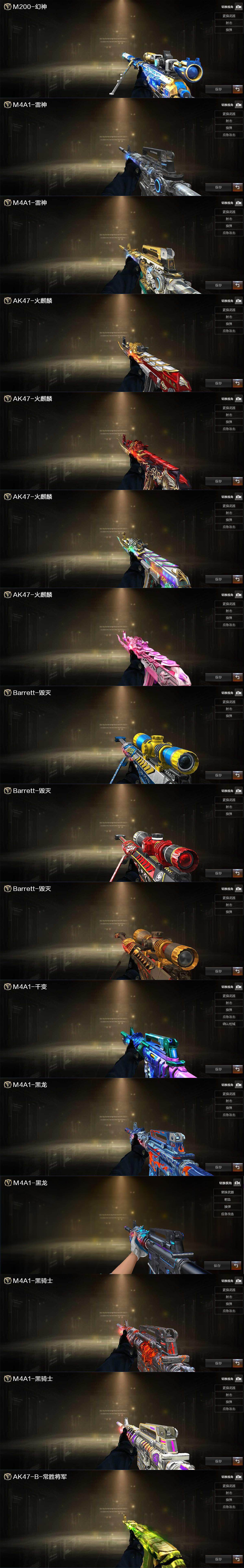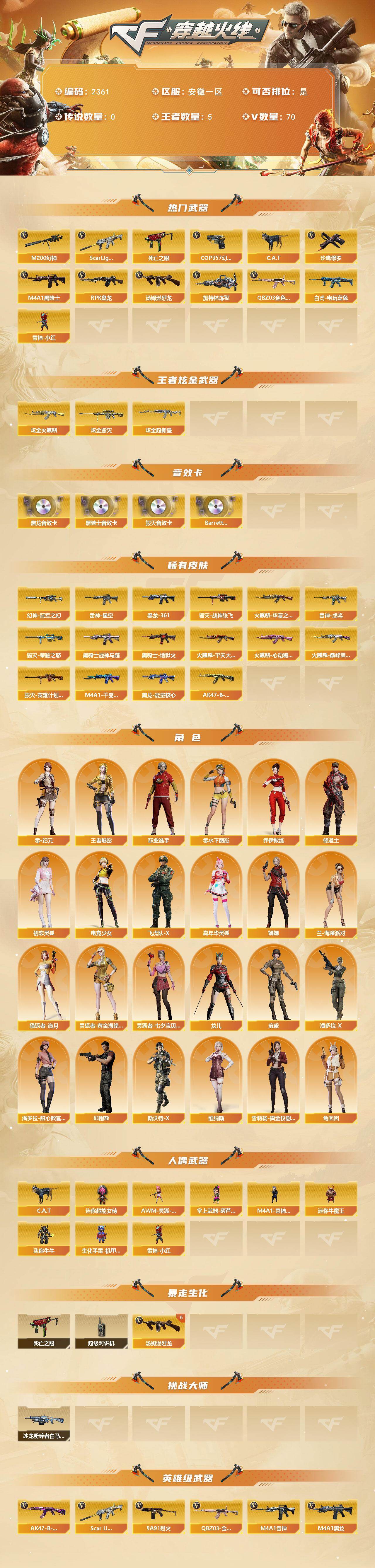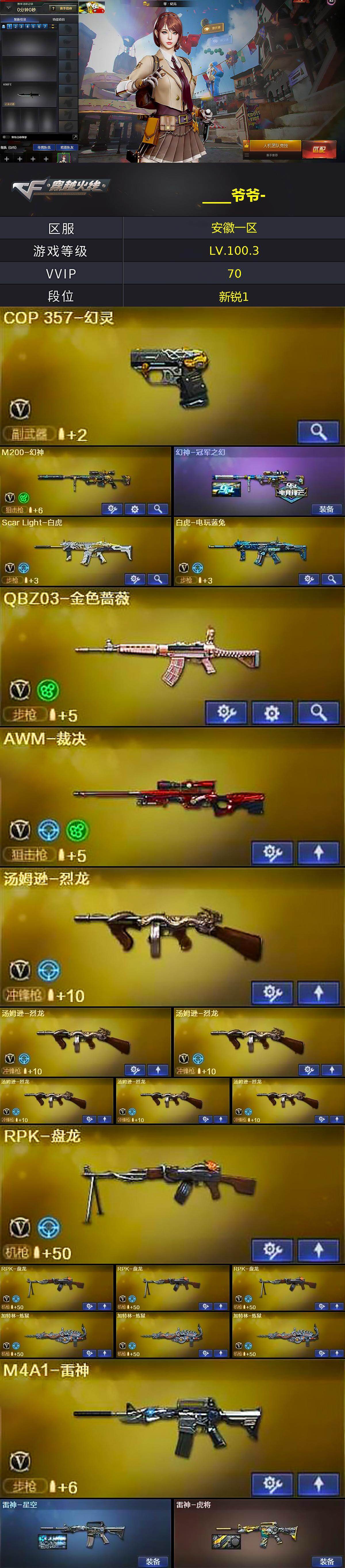 安徽一区-77V-5王者武器数-3炫金武器数【热门武器】:QBZ03-金色蔷薇,Scar Light-白虎,M200-幻神,死亡之眼*2,白虎-电玩蓝兔,C.A.T,M4A1-黑骑士,汤姆逊-烈龙*6,RPK-盘龙*4,加特林-炼狱*3,雷神-小红,COP 357-幻灵,沙鹰-修罗*4【王者炫金武器】:炫金火麒麟,炫金超新星,炫金毁灭【音效卡】:M4A1-黑龙音效卡,M4A1-黑骑士音效卡,Barrett-毁灭音效卡,Barrett-碧霄极光音效卡*5【皮肤】:幻神-冠军之幻,雷神-星空,雷神-
