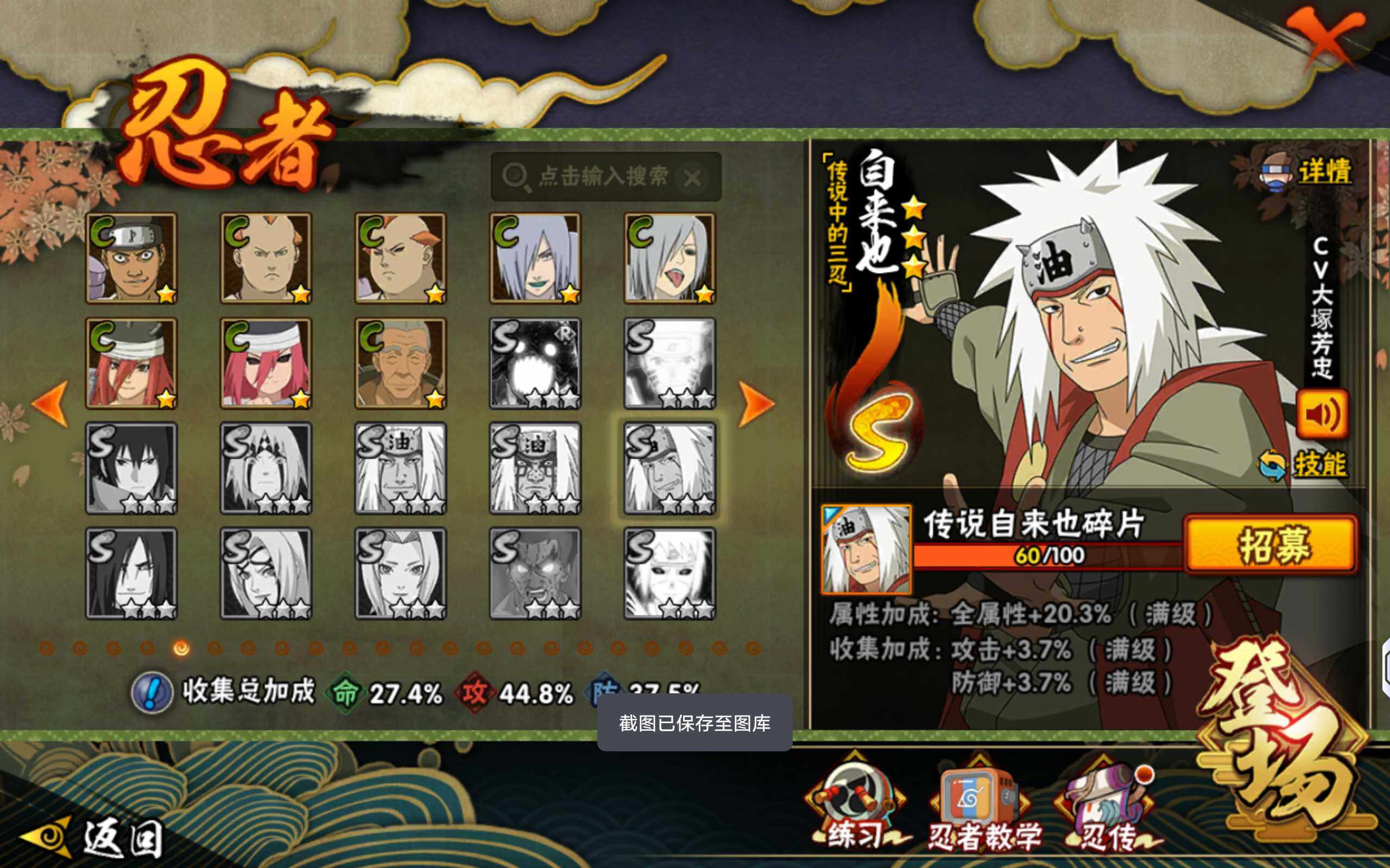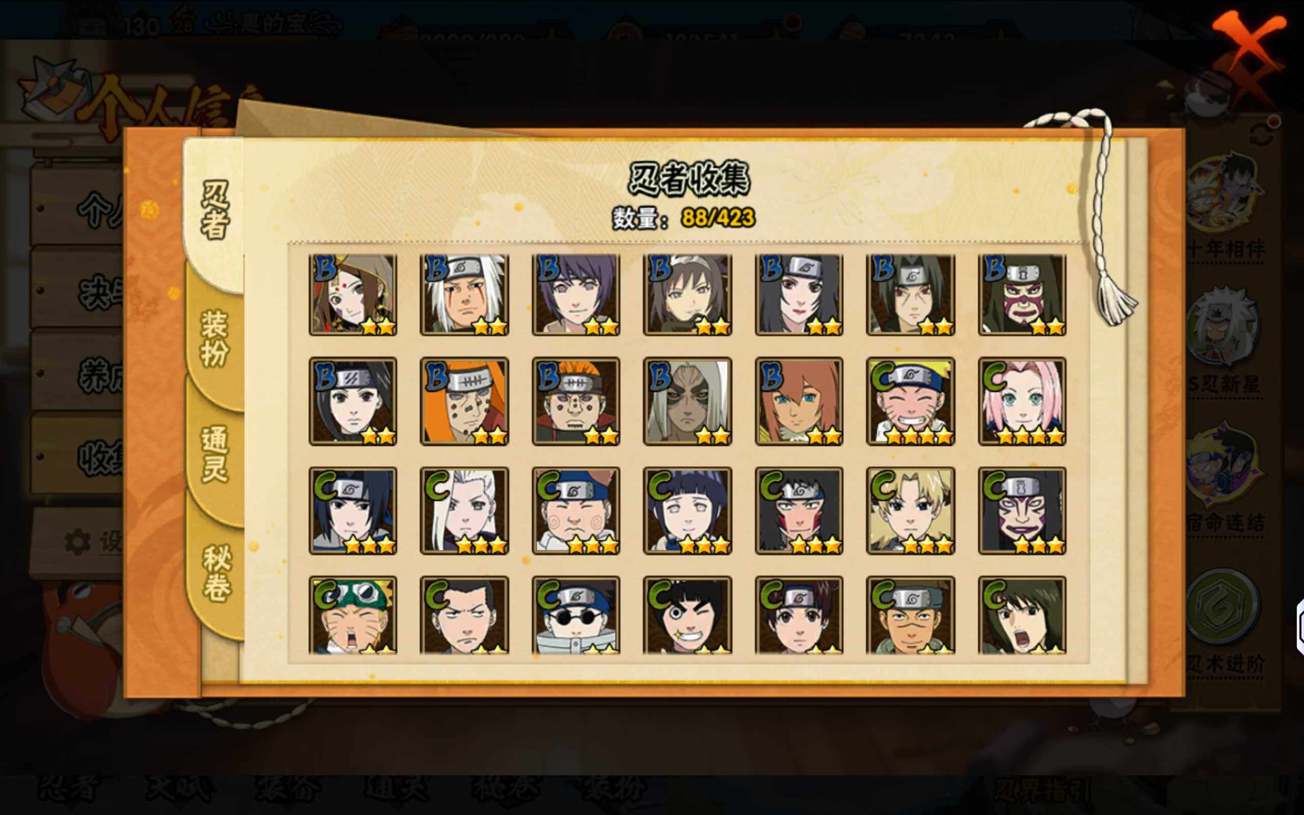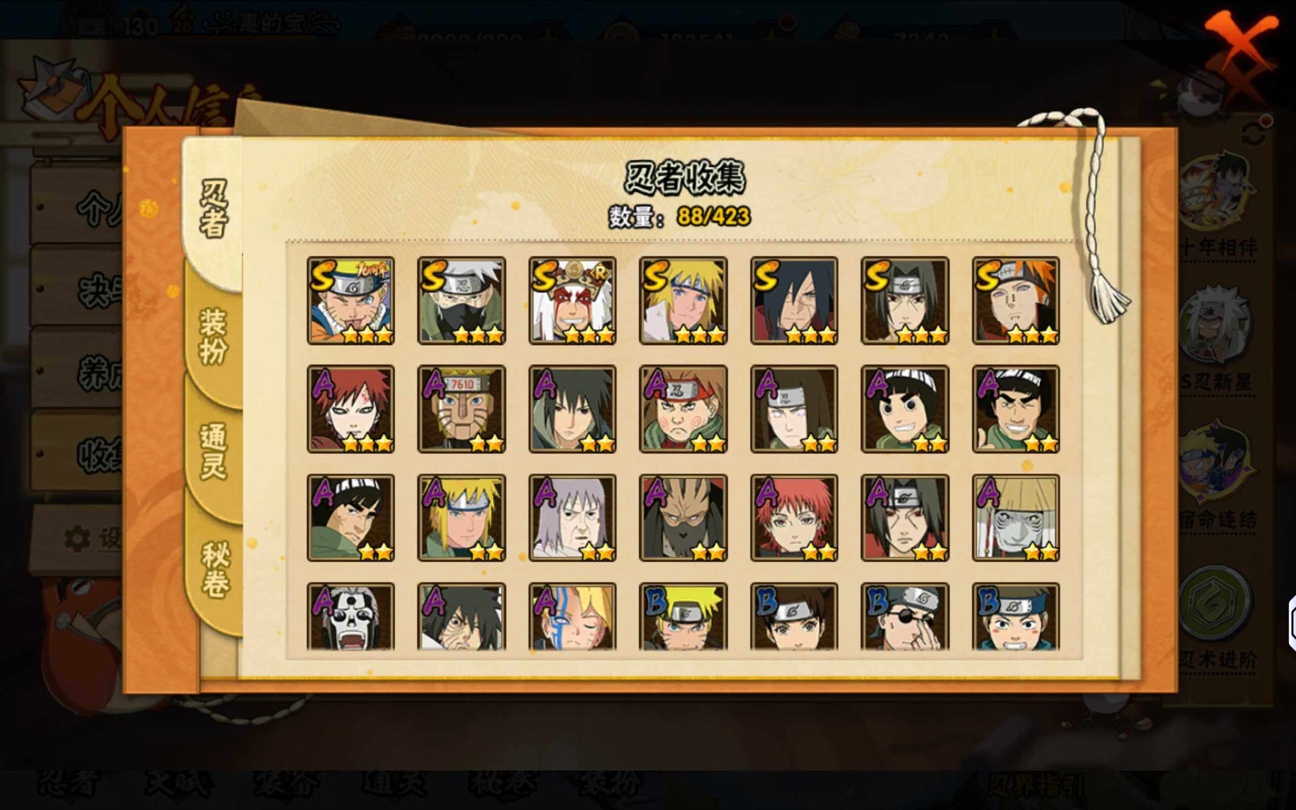 【S级忍者】:宇智波斑「秽土转生·解」(3星),宇智波鼬「须佐能乎」(3星),旗木卡卡西「须佐能乎」(3星),自来也「舞之豪杰」(3星),波风水门(3星),佩恩「天道」(3星),漩涡鸣人·宇智波佐助(3星)