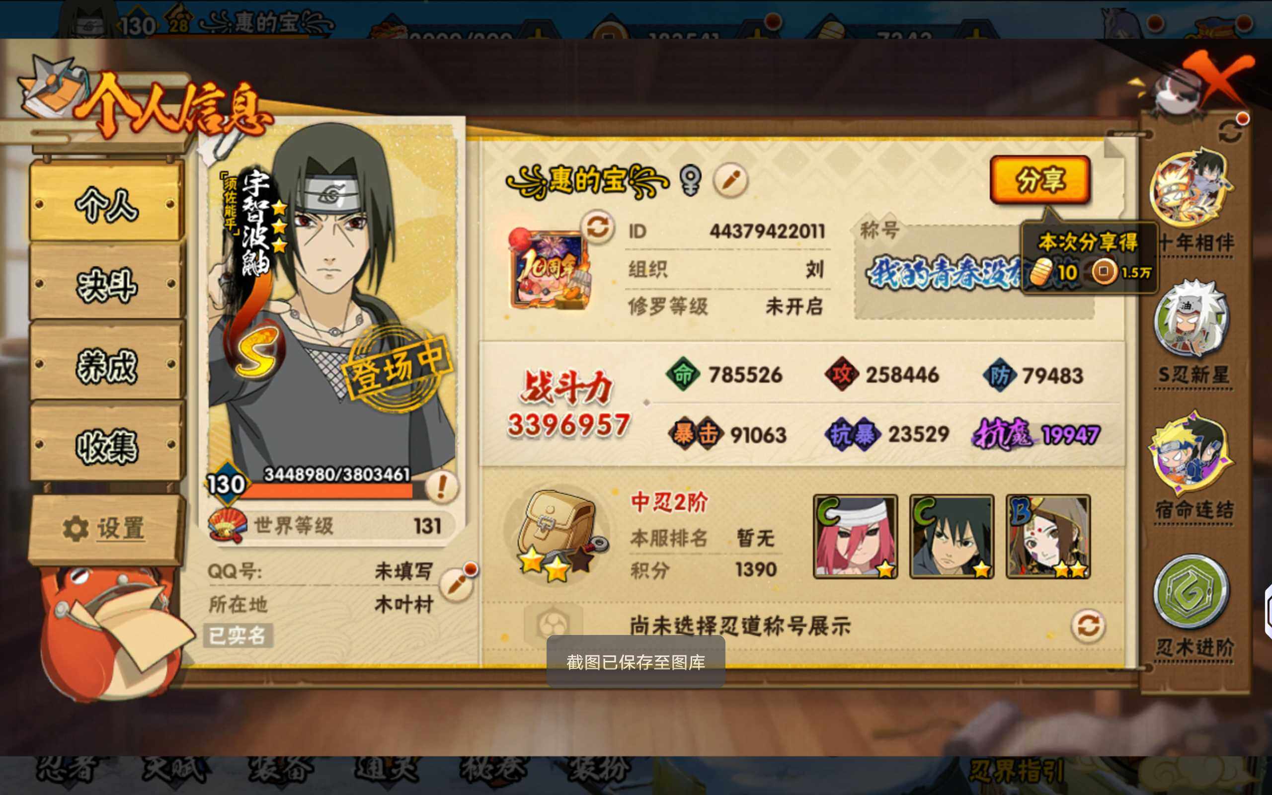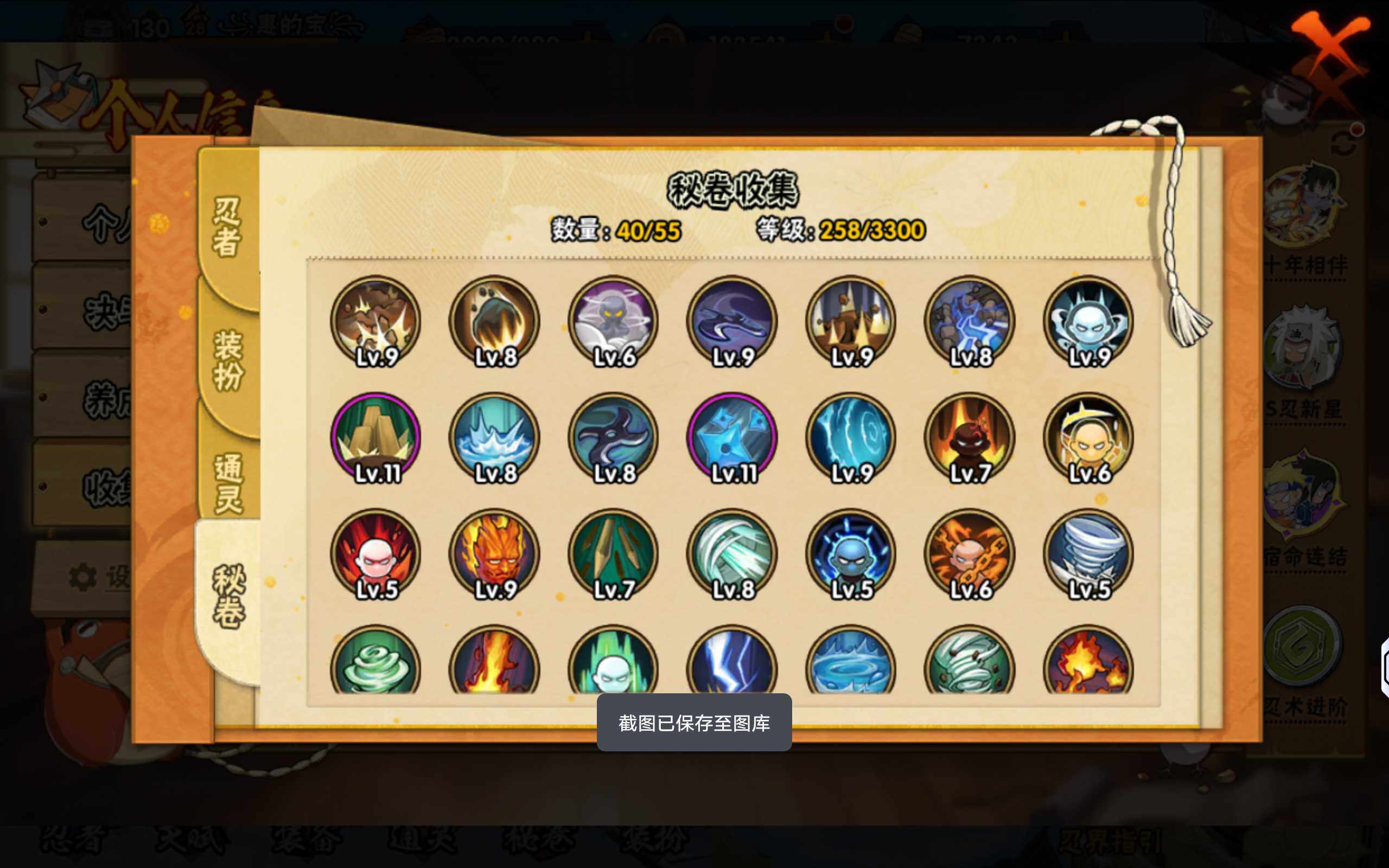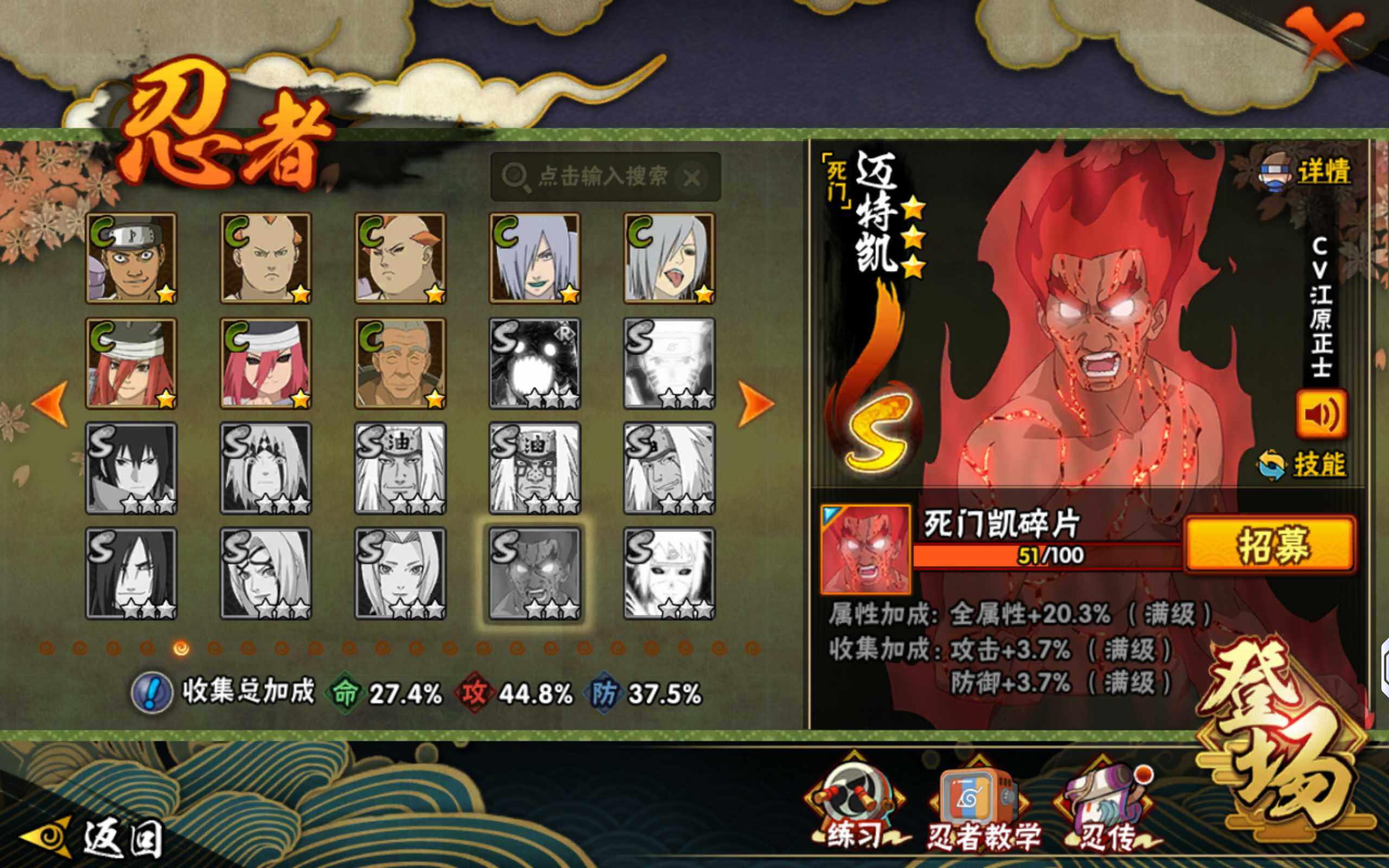 【S级忍者】:宇智波斑「秽土转生·解」(3星),宇智波鼬「须佐能乎」(3星),旗木卡卡西「须佐能乎」(3星),自来也「舞之豪杰」(3星),波风水门(3星),佩恩「天道」(3星),漩涡鸣人·宇智波佐助(3星)