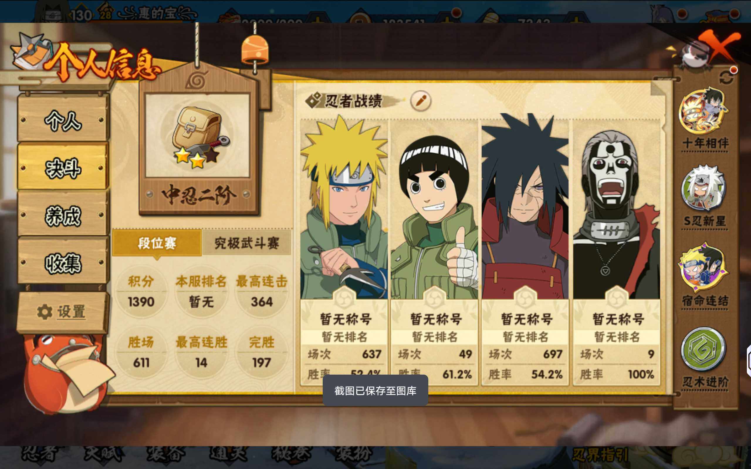 【A级忍者】:波风水门「青年」(2星),飞段「死司凭血」(2星),干柿鬼鲛(2星),漩涡博人「桃式显现」(2星),机械鸣人「初始形态」(