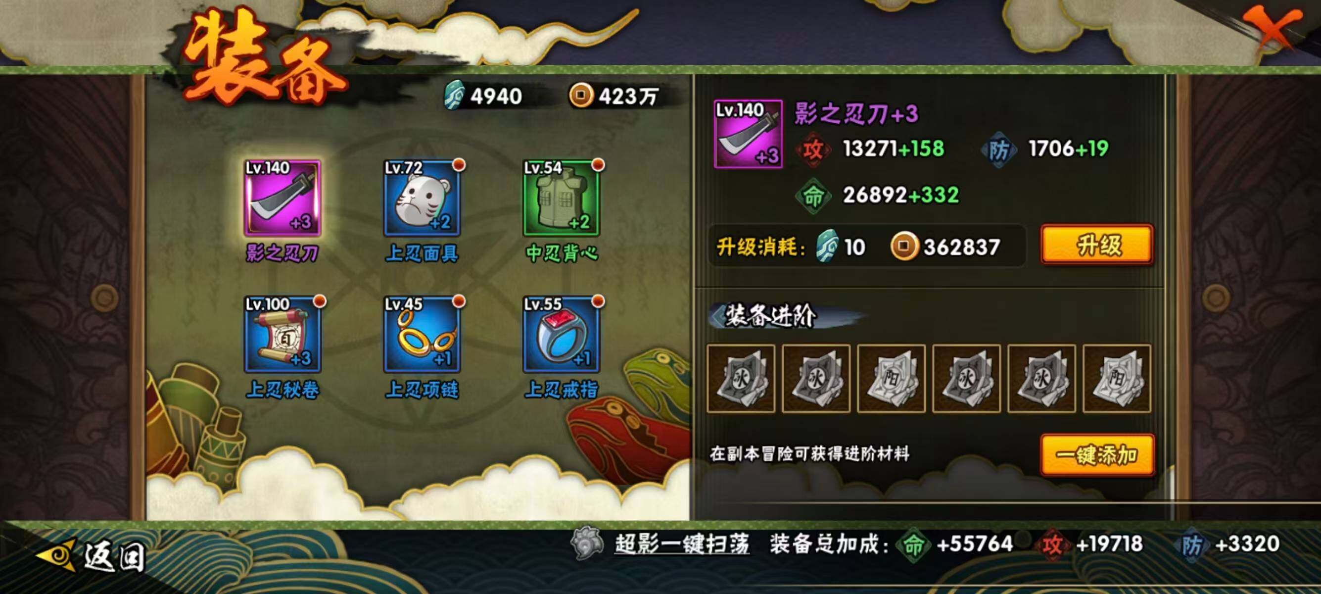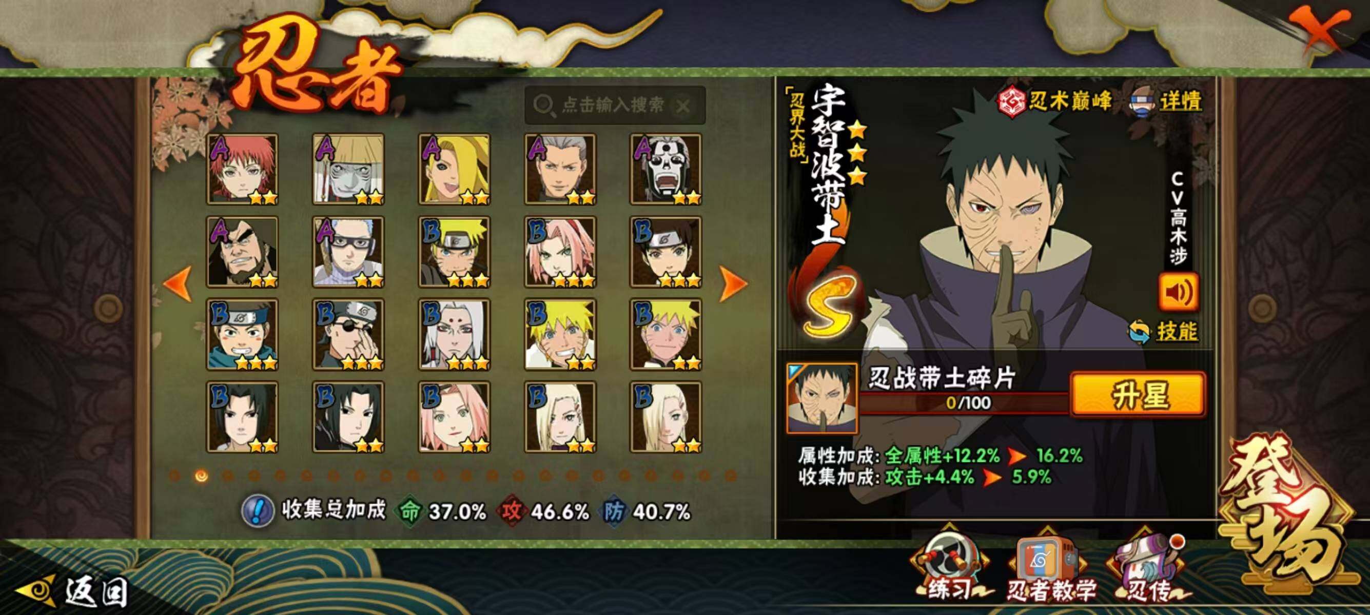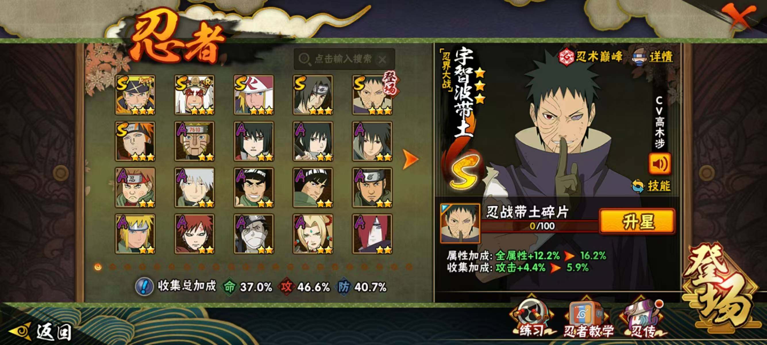 【S级忍者】:宇智波带土「忍界大战」(3星),宇智波鼬「须佐能乎」(3星),自来也「舞之豪杰」(3星),波风水门(3星),佩恩「天道」(3星),漩涡鸣人·宇智波佐助(3星)