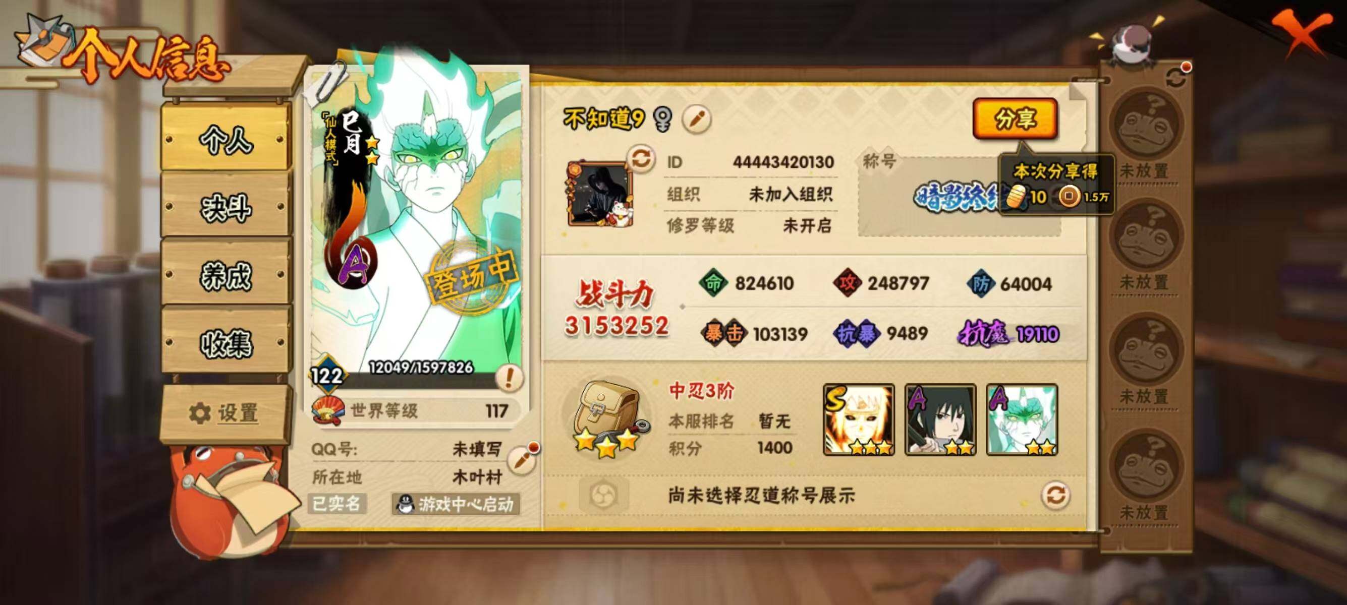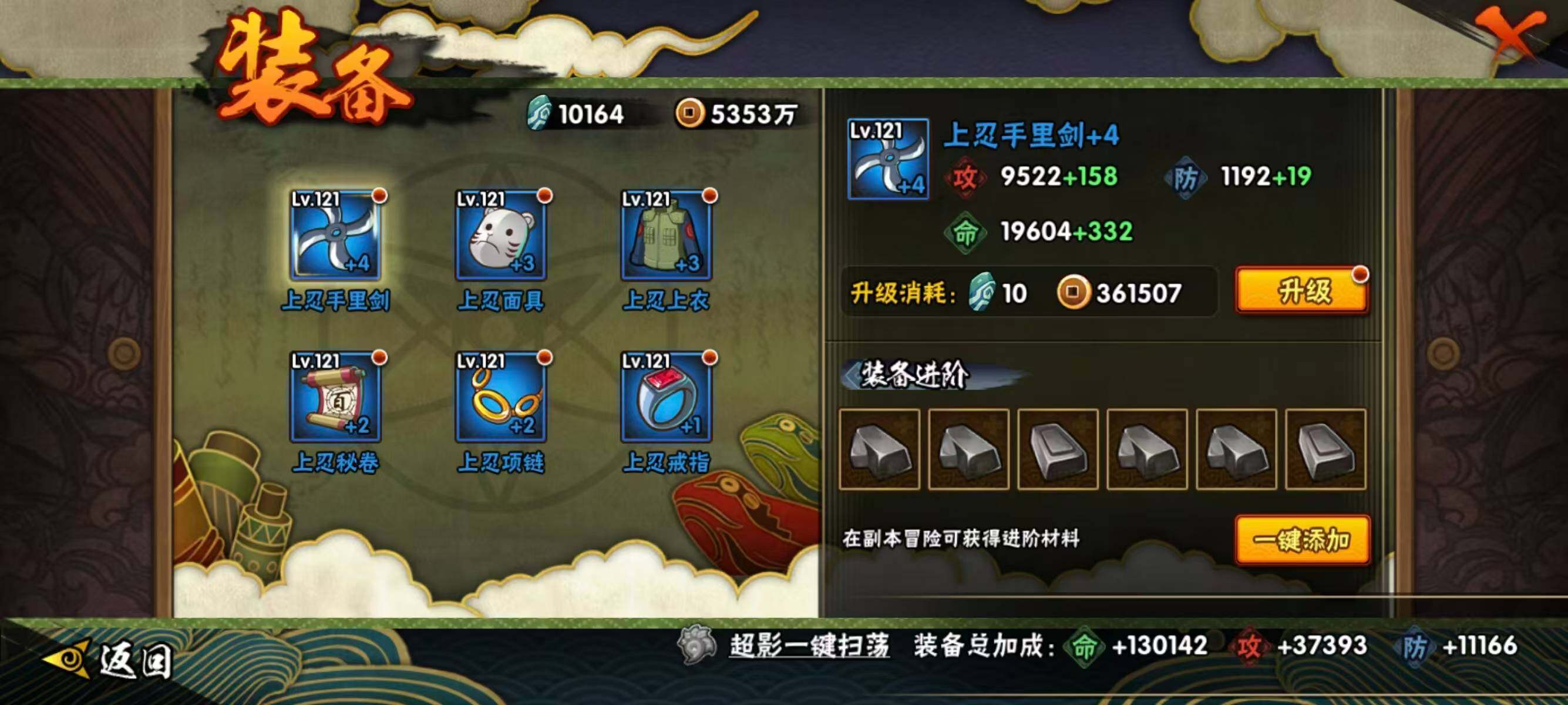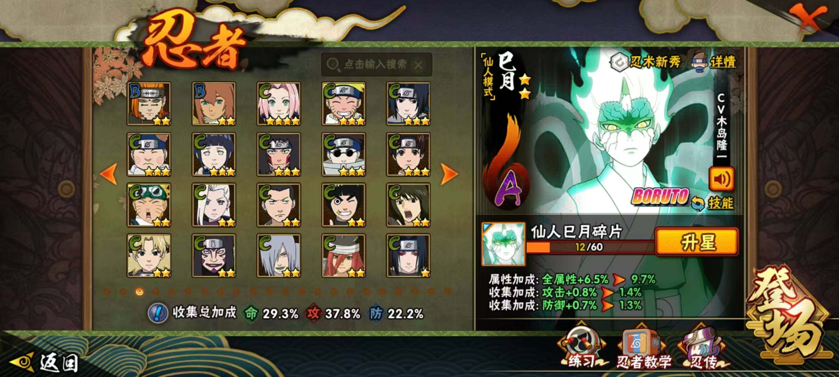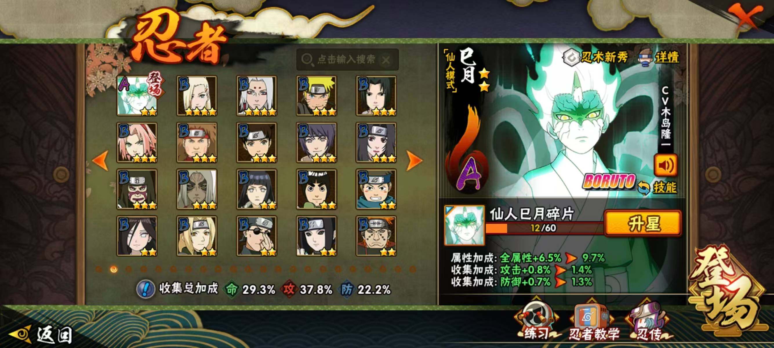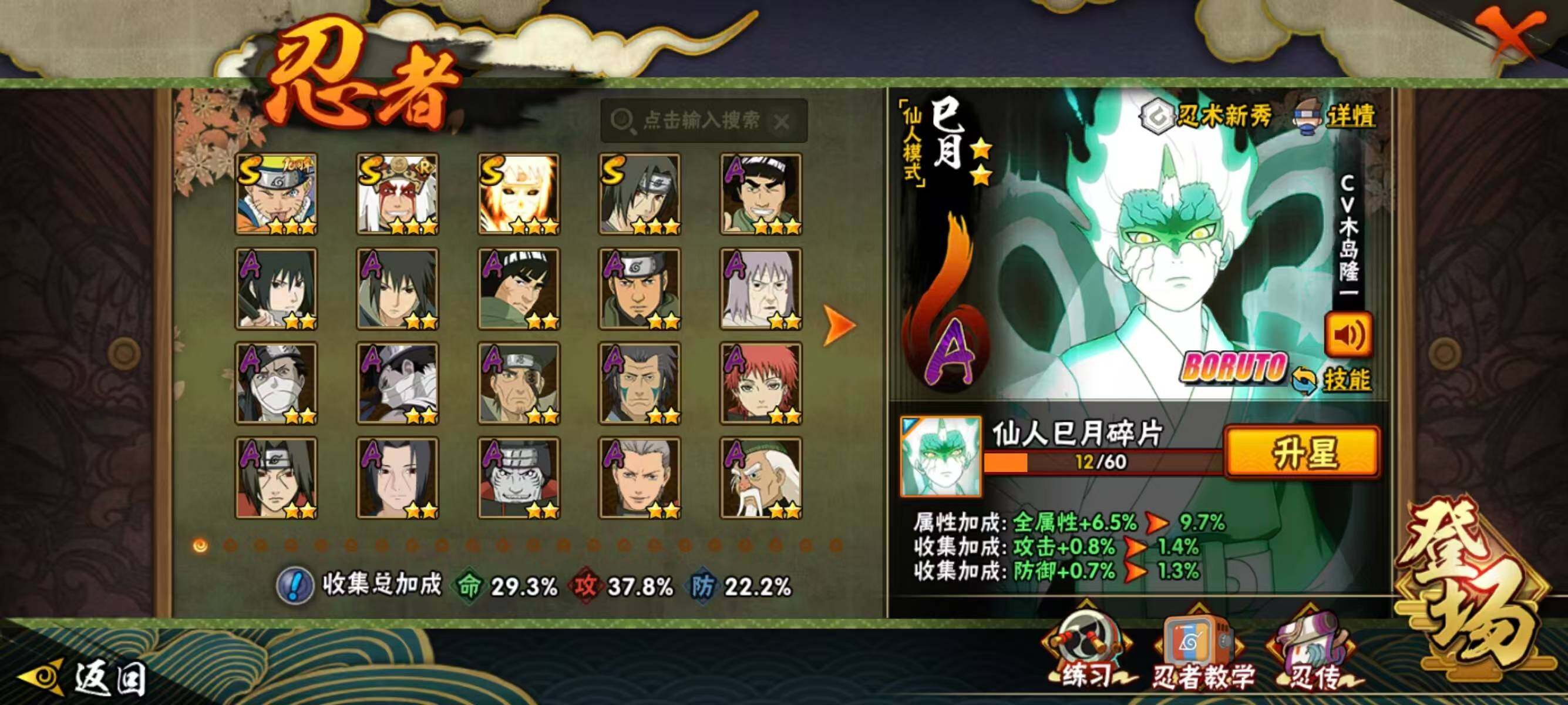 【S级忍者】:宇智波鼬「须佐能乎」(3星),自来也「舞之豪杰」(3星),波风水门「九喇嘛连结」(3星),漩涡鸣人·宇智波佐助(3星)