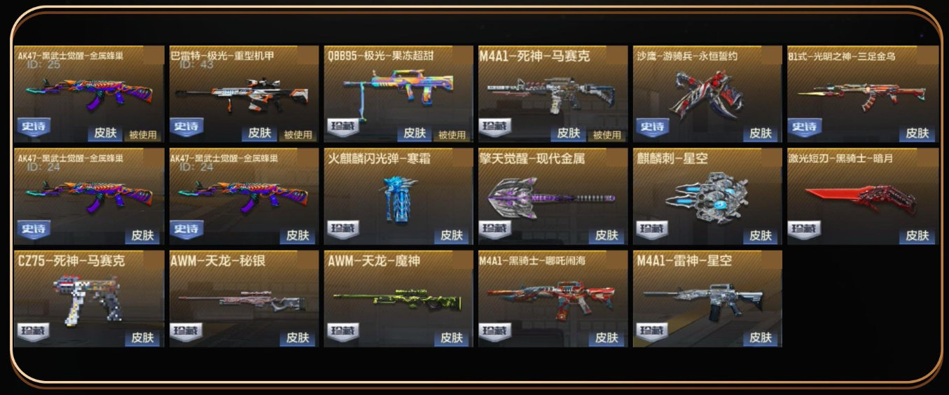 【苹果QQ】 角色等级:少将4 【武器】M12S-雷霆王者、AK47-奉先、虎头湛金枪、TAC-雷暴、巴雷特-雷霆、巴雷特-极光、98K-黑骑士、M4A1-赛博雷神、AUG-机械纪元、HK417-朱雀、A180-地狱凤凰、汤姆逊-烈龙、M12S-雷霆、寒霜烈龙、COP 357-雷霆、迷你饕餮、嗜血金鲨、M4A1-死神、VEPR12-宙斯、加特林-堡垒觉醒、毁灭征服者-超越Max、G3A3-衍神兵、MK47-金角巨兽、HK417-炎龙铠甲、猎弩-虫族女王、烈焰弓、环刃-炫光掠影觉醒、末日裁决觉醒、