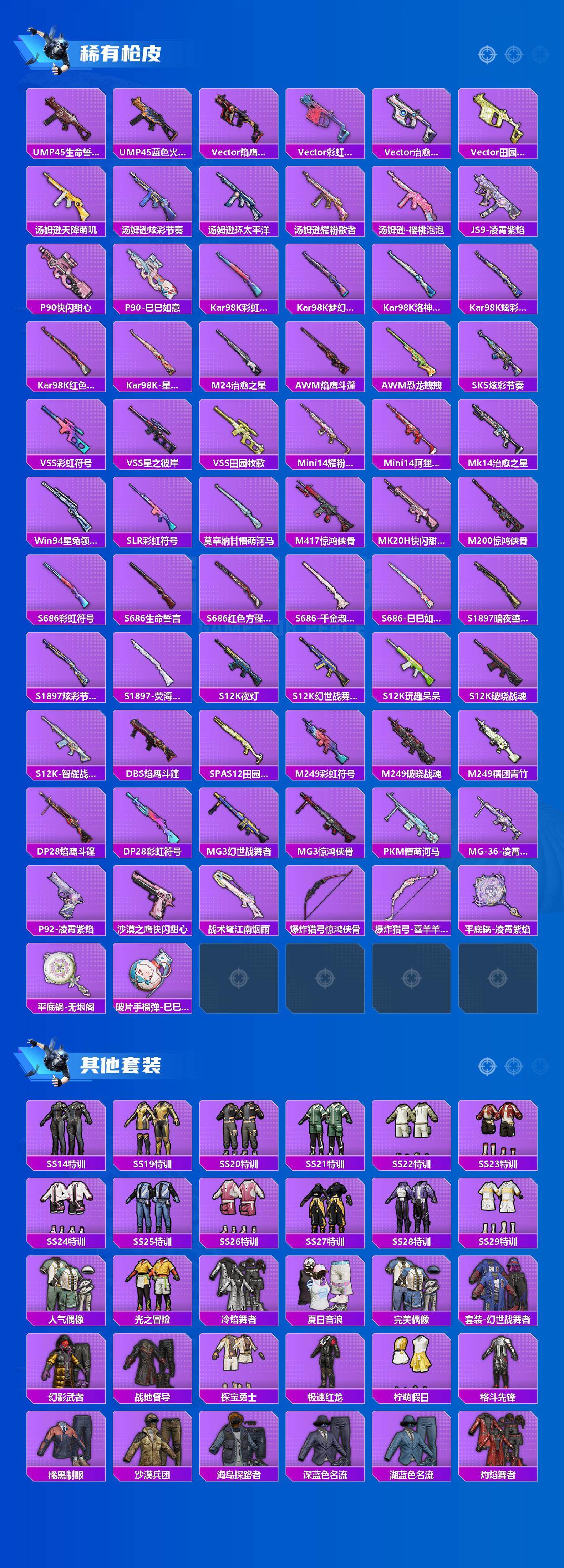 【粉色枪皮等级】:Vector-环太平洋(七级),Kar98K-巳巳如意(五级),Mk14-福马献瑞(五级),DP