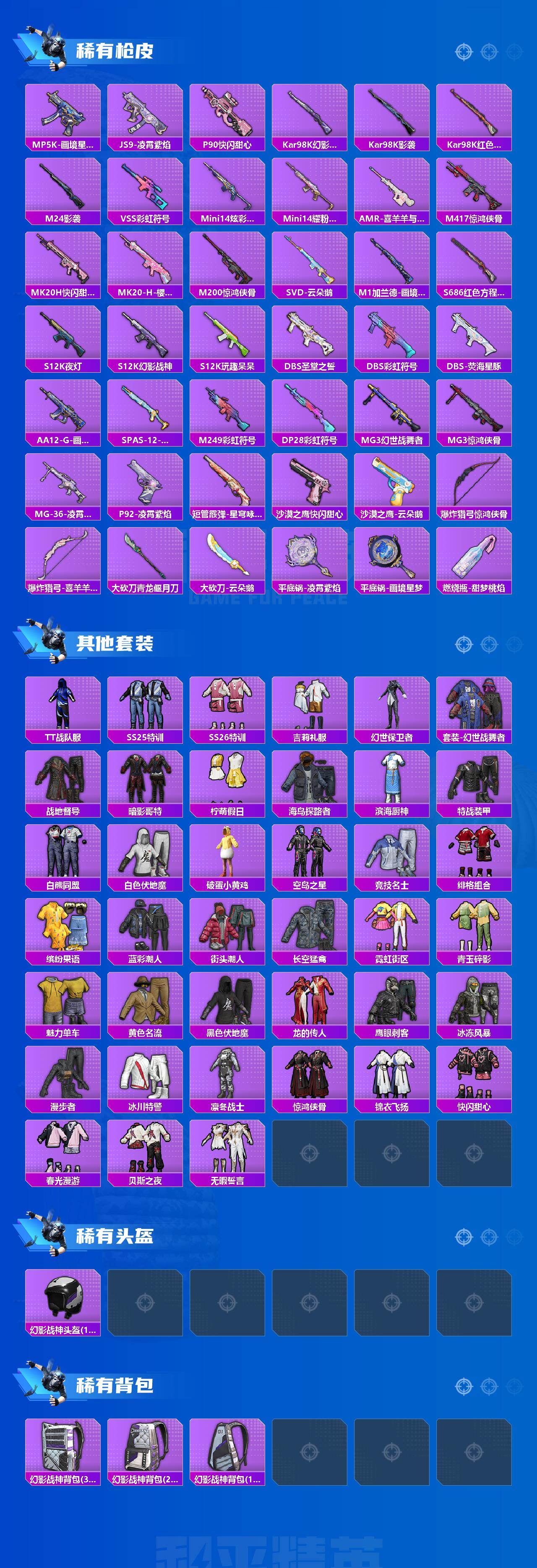 【粉色枪皮等级】:AKM-绿萝繁花(五级),AUG-暖羊咩咩(五级),蜜獾-异瞳寒姬(五级