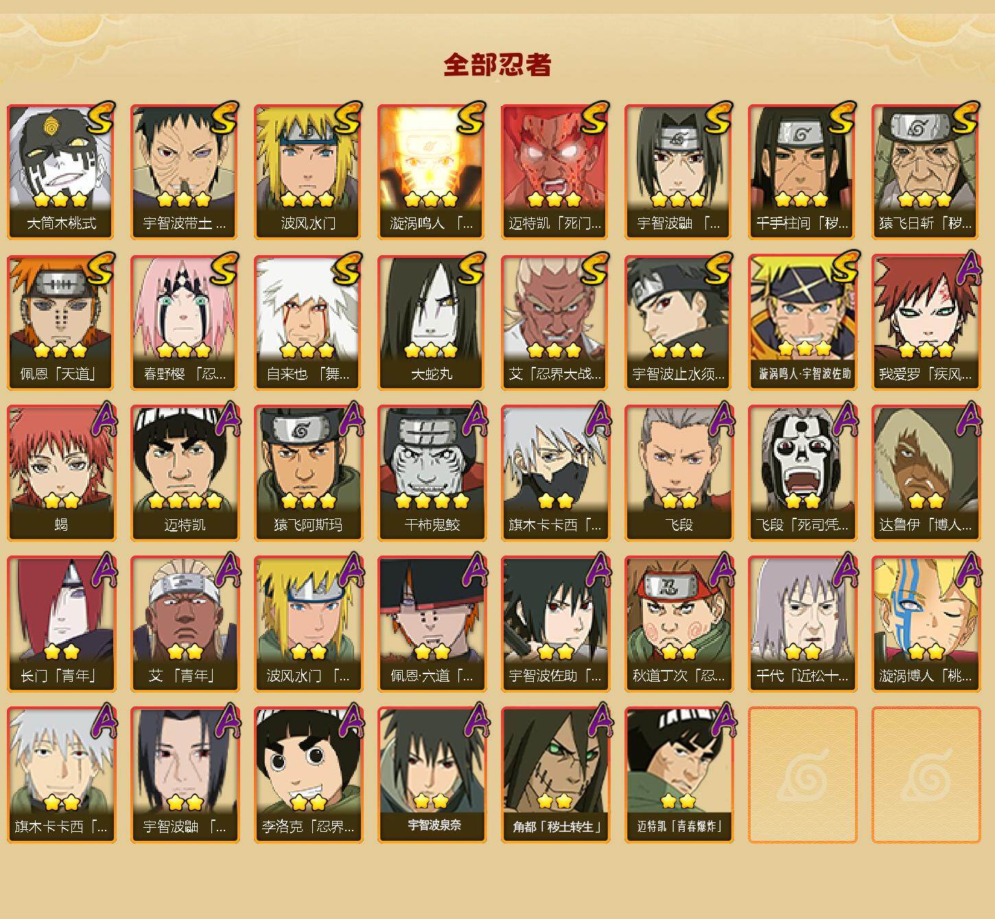 【S级忍者】:猿飞日斩「秽土转生」(3星),千手柱间「秽土转生」(3星),春野樱「忍界大战」(3星),宇智波带土「忍界大战」(3星),艾「忍界大战」(3星),宇智波鼬「须佐能乎」(3星),宇智波止水「须佐能乎」(3星),自来也「舞之豪杰」(3星),大蛇丸(3星),波风水门(3星),漩涡鸣人「九喇嘛连结」(3星),迈特凯「死门」(3星),佩恩「天道」(3星),大筒木桃式(3星),漩涡鸣人·宇智波佐助(3星)