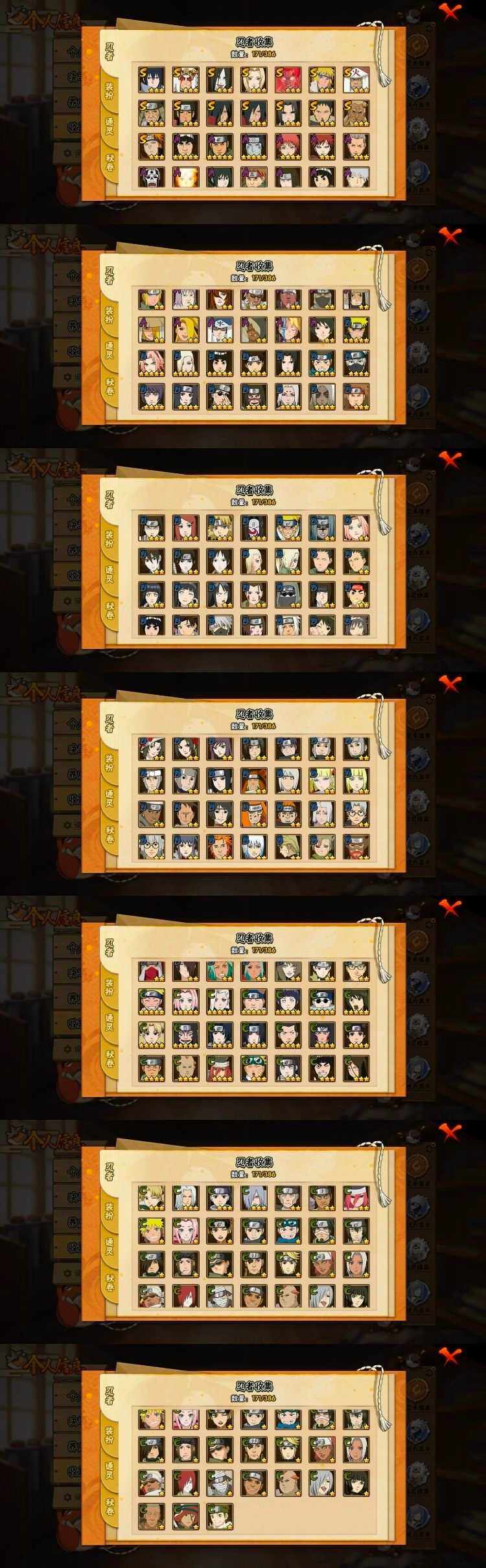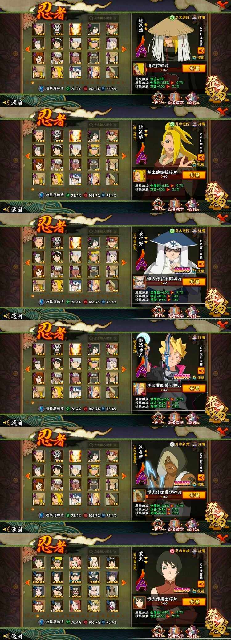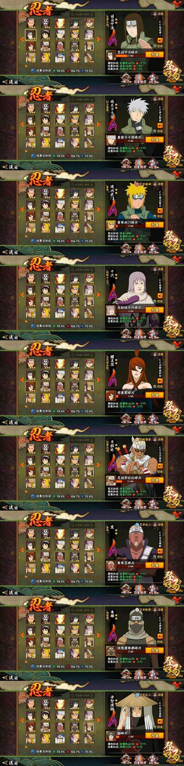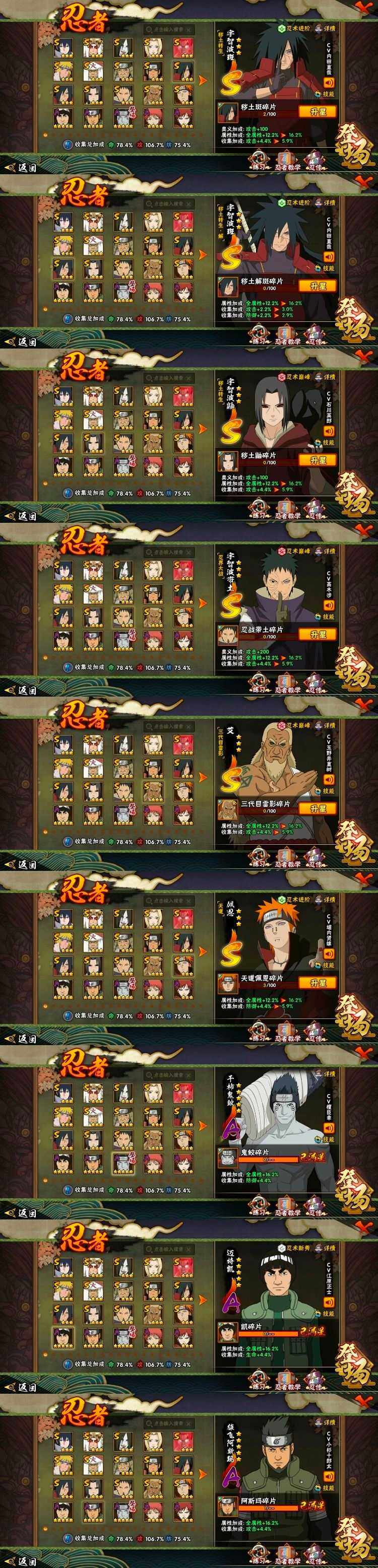 【S级忍者】:猿飞日斩「秽土转生」(3星),千手柱间「秽土转生」(3星),宇智波鼬「秽土转生」(3星),宇智波斑「秽土转生」(3星),宇智波斑「秽土转生·解」(3星),宇智波带土「忍界大战」(3星),艾「三代目雷影」(3星),自来也「舞之豪杰」(3星),大蛇丸(3星),纲手(3星),猿飞日斩(3星),波风水门(3星),迈特凯「死门」(3星),佩恩「天道」(3星),宇智波佐助「永恒万花筒」(3星)【A级忍者】:艾「青年」(2星),波风水门「青年」(2星),达鲁伊「博人传」(2星),迪达拉(2星),