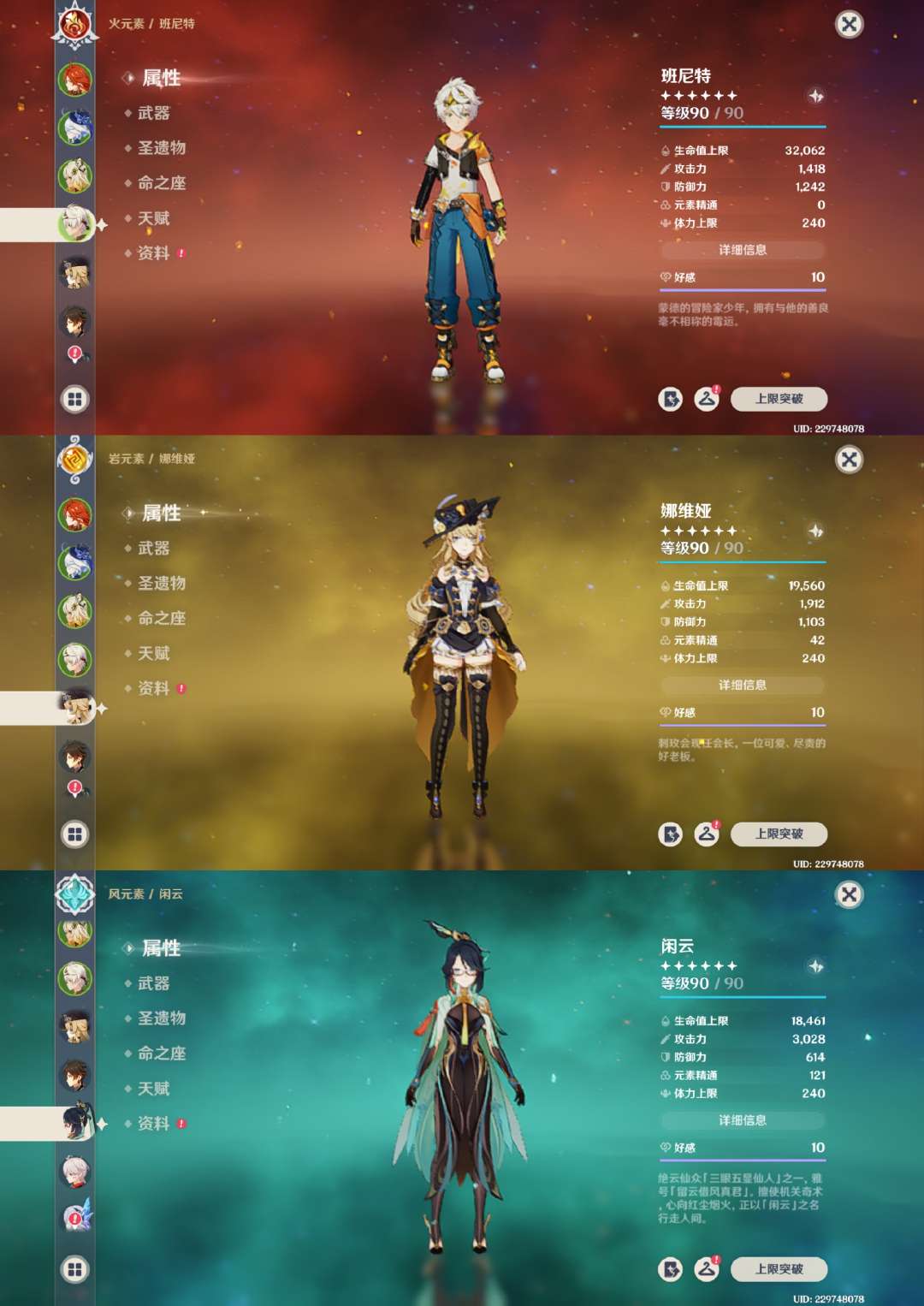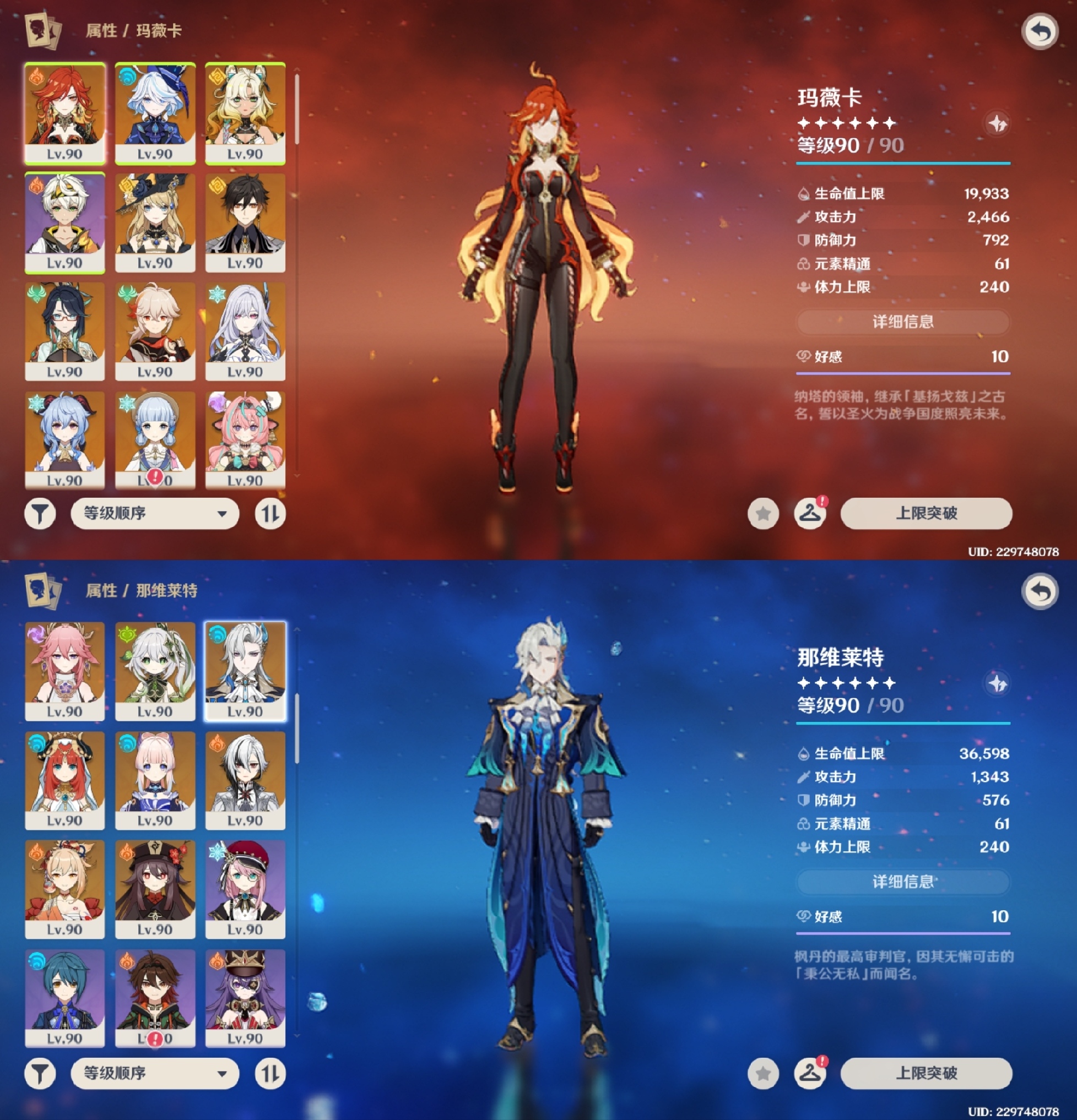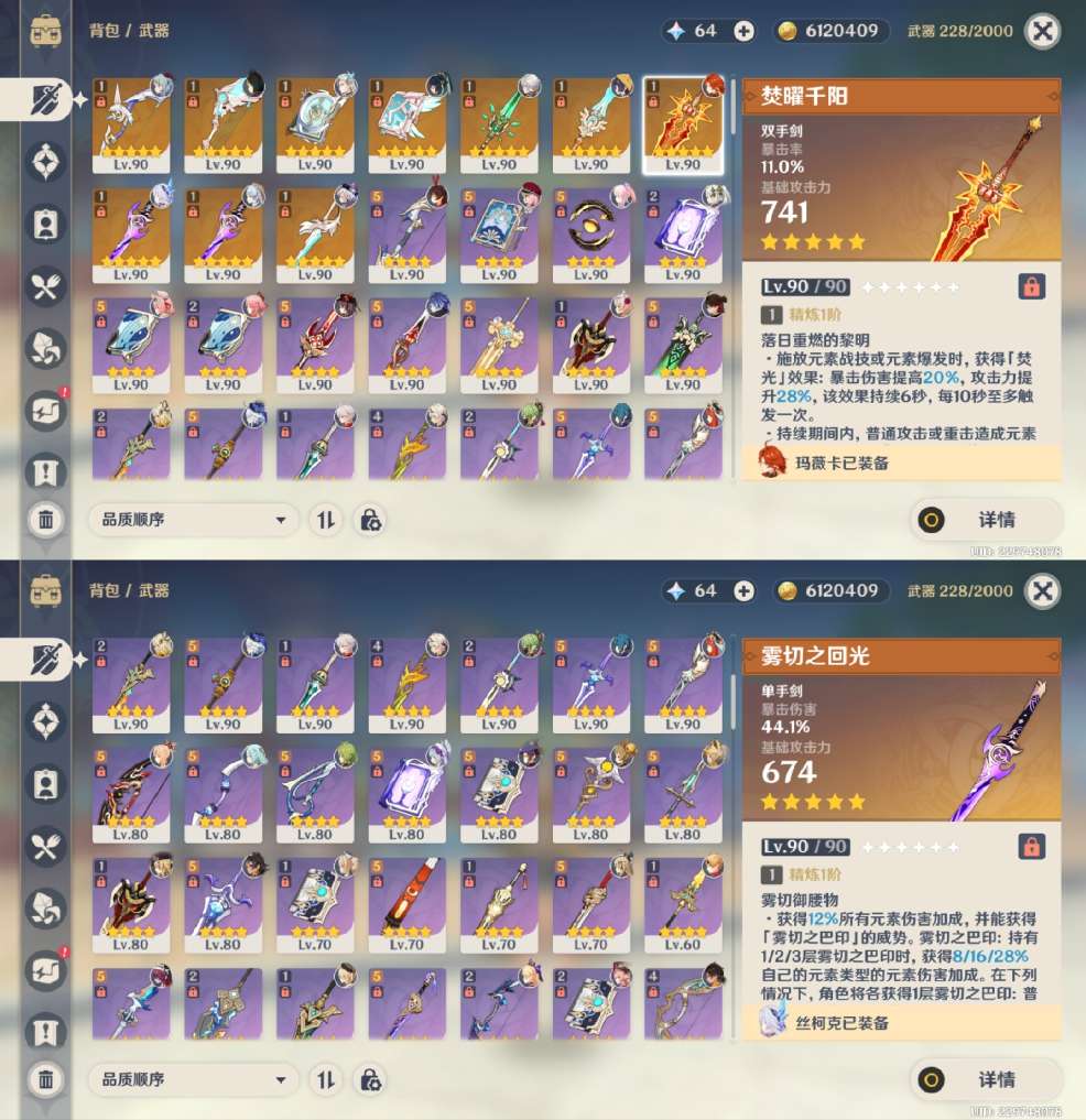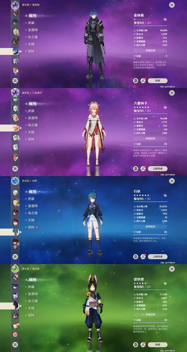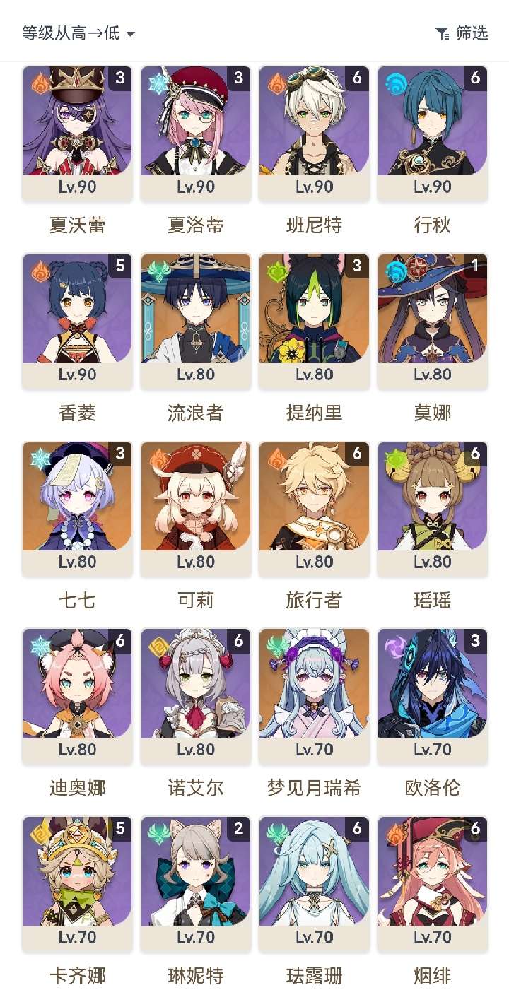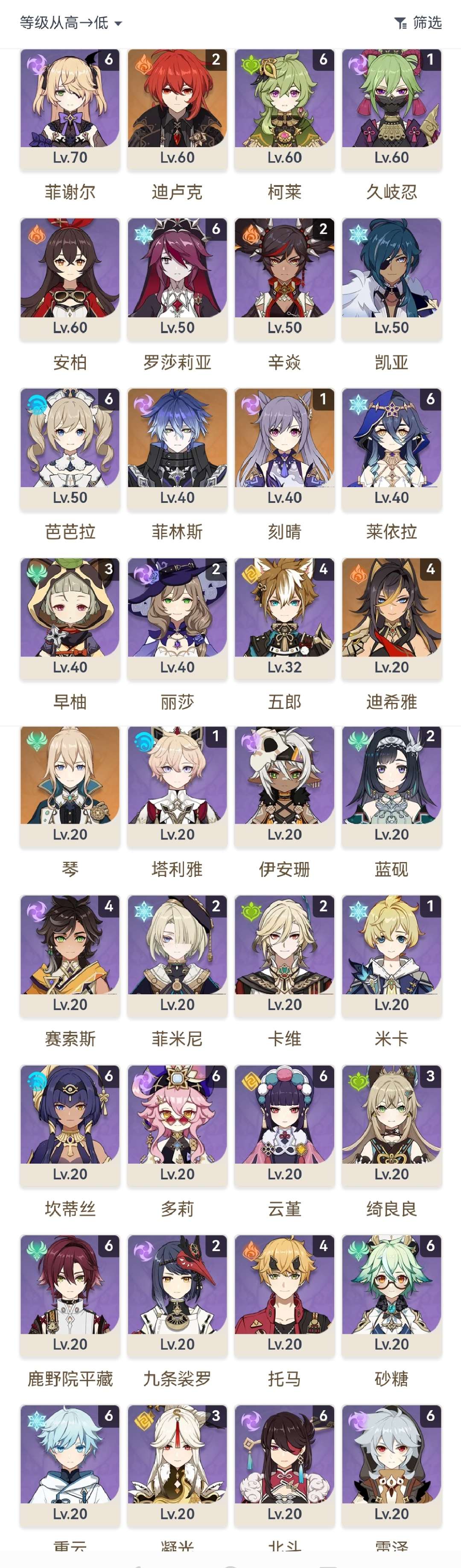 火神2命带专武,芙宁娜提纳里3命,龙王希诺宁万叶1命,神里绫华带专武,号里专武很多,角色练度都很高