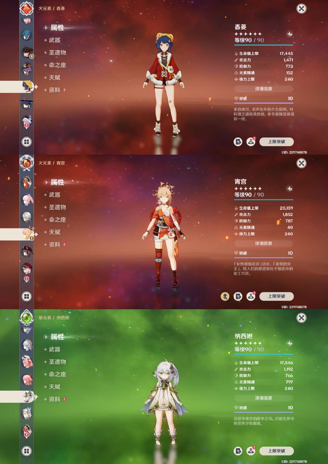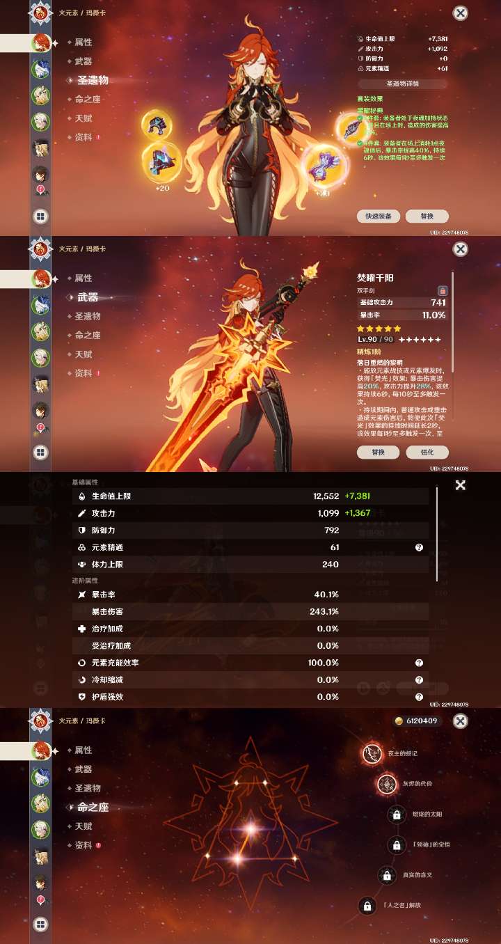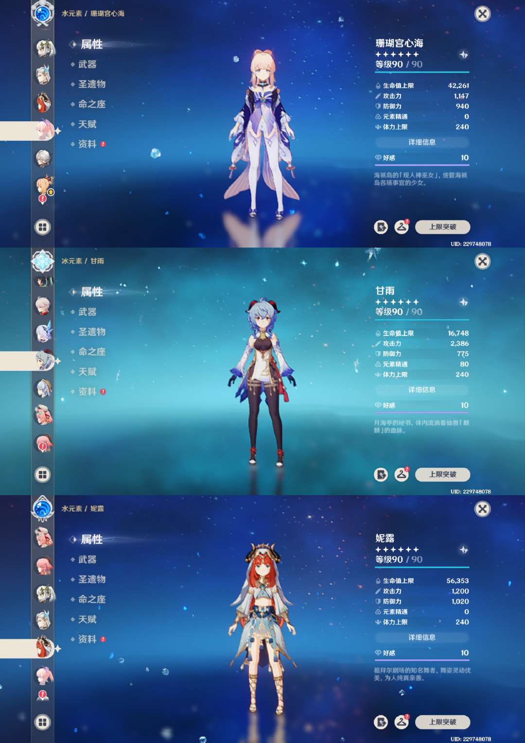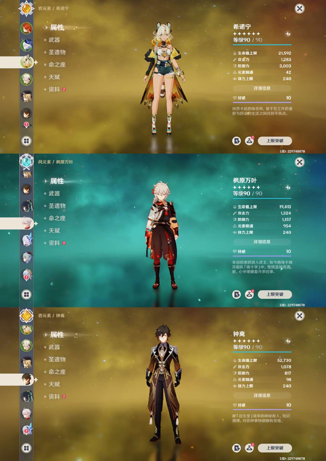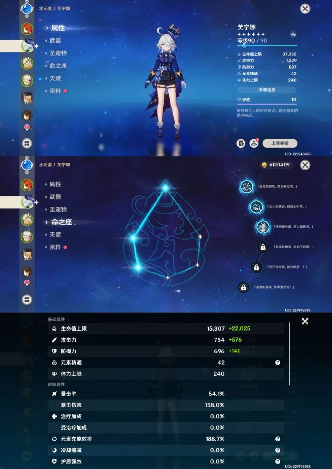 火神2命带专武,芙宁娜提纳里3命,龙王希诺宁万叶1命,神里绫华带专武,号里专武很多,角色练度都很高