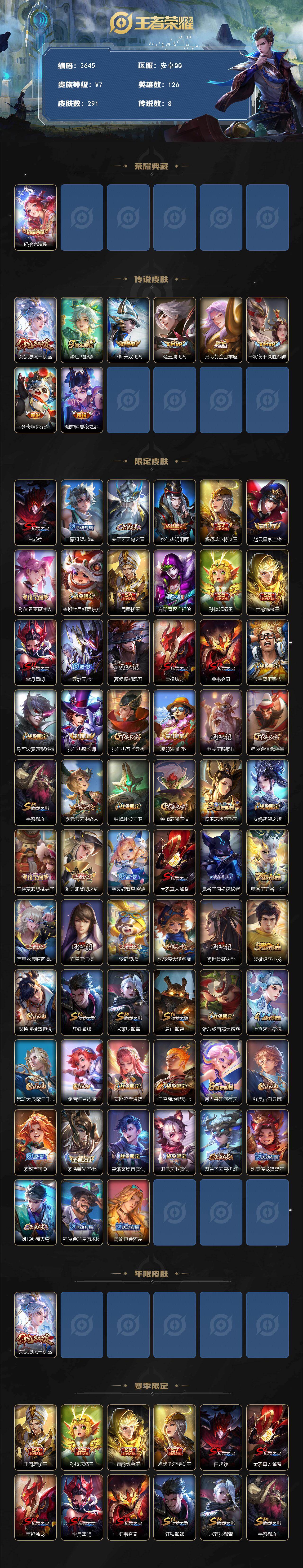贵族7-贵族积分23855-291皮-1典藏-8传说-2全皮英雄-星传说金色仲夏夜-4改名卡-1灵宝改名卡 安卓手Q2区