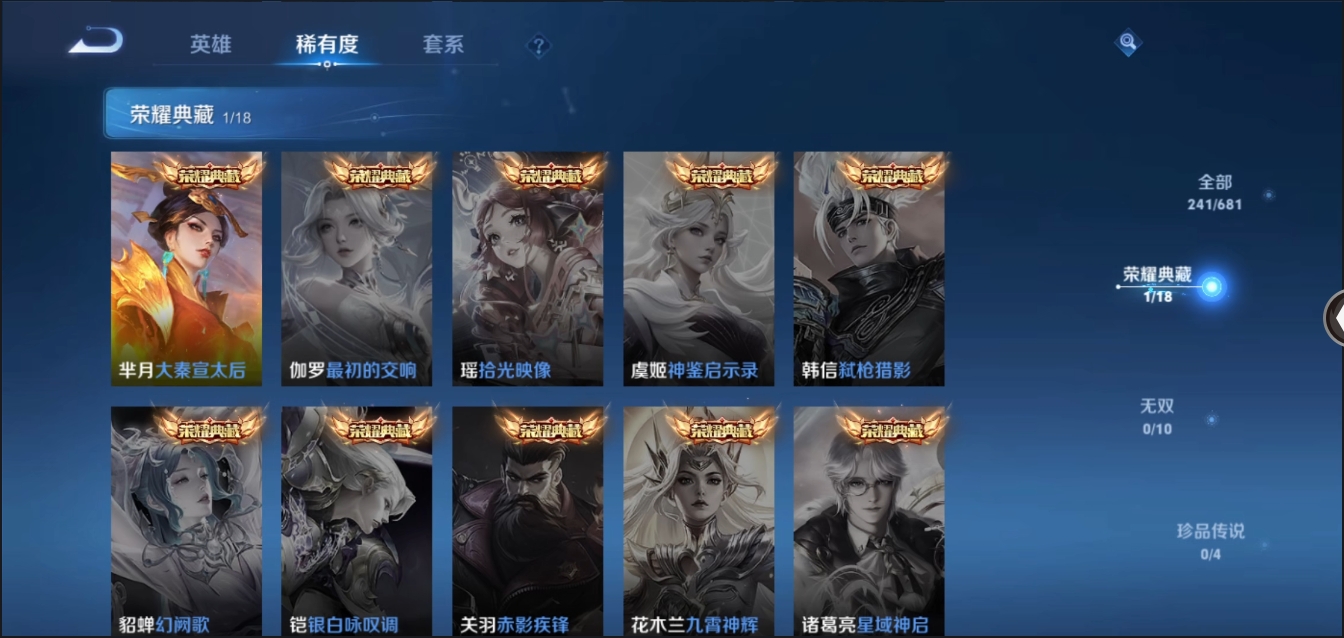 V8-至尊星耀I段位-121英雄-241皮肤-1典藏-0珍品无双-0无双-0珍品传说-16传说-62史诗