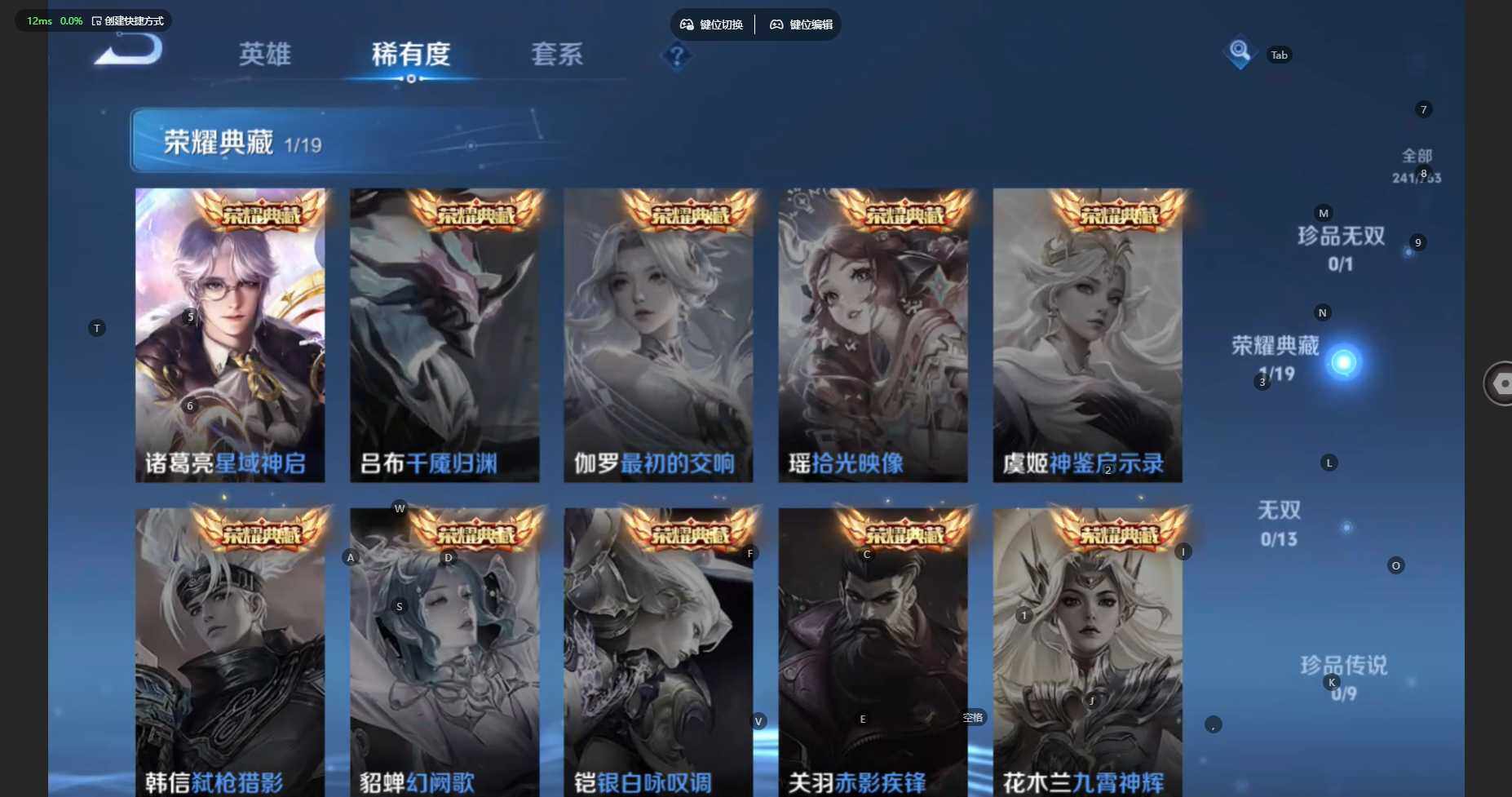 V6-最强王者段位-126英雄-241皮肤-1典藏皮肤-3传说-69限定-5按键-17印记