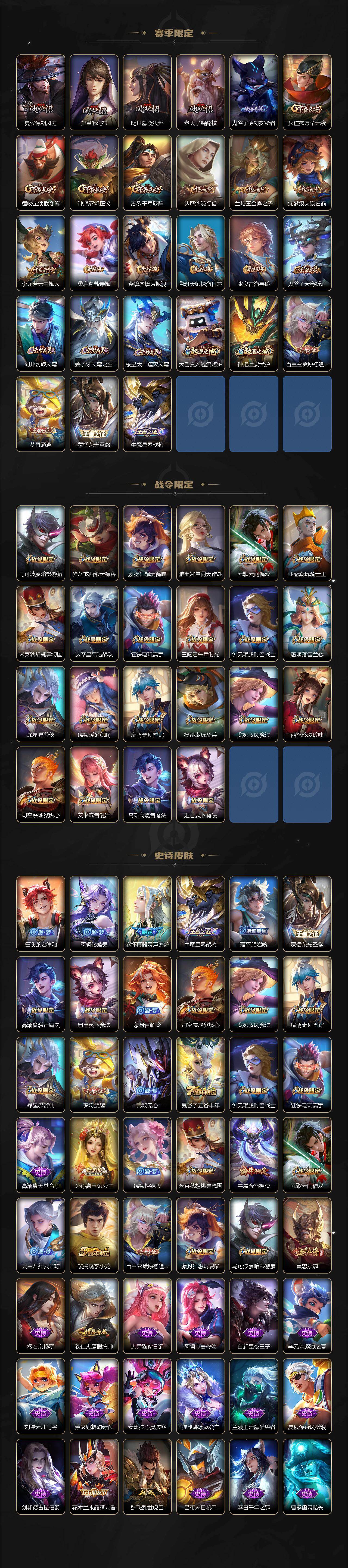 【限定皮肤】:蒙犽顽岩魄,姜子牙天穹之誓,狄仁杰阴阳师,赵云皇家上将,孙尚香蔷薇恋人,鲁班七号寅虎瑞焰,高渐离死亡摇滚,高渐离玩趣恶龙,钟无艳超时空战士,扁鹊奇幻香踪,元