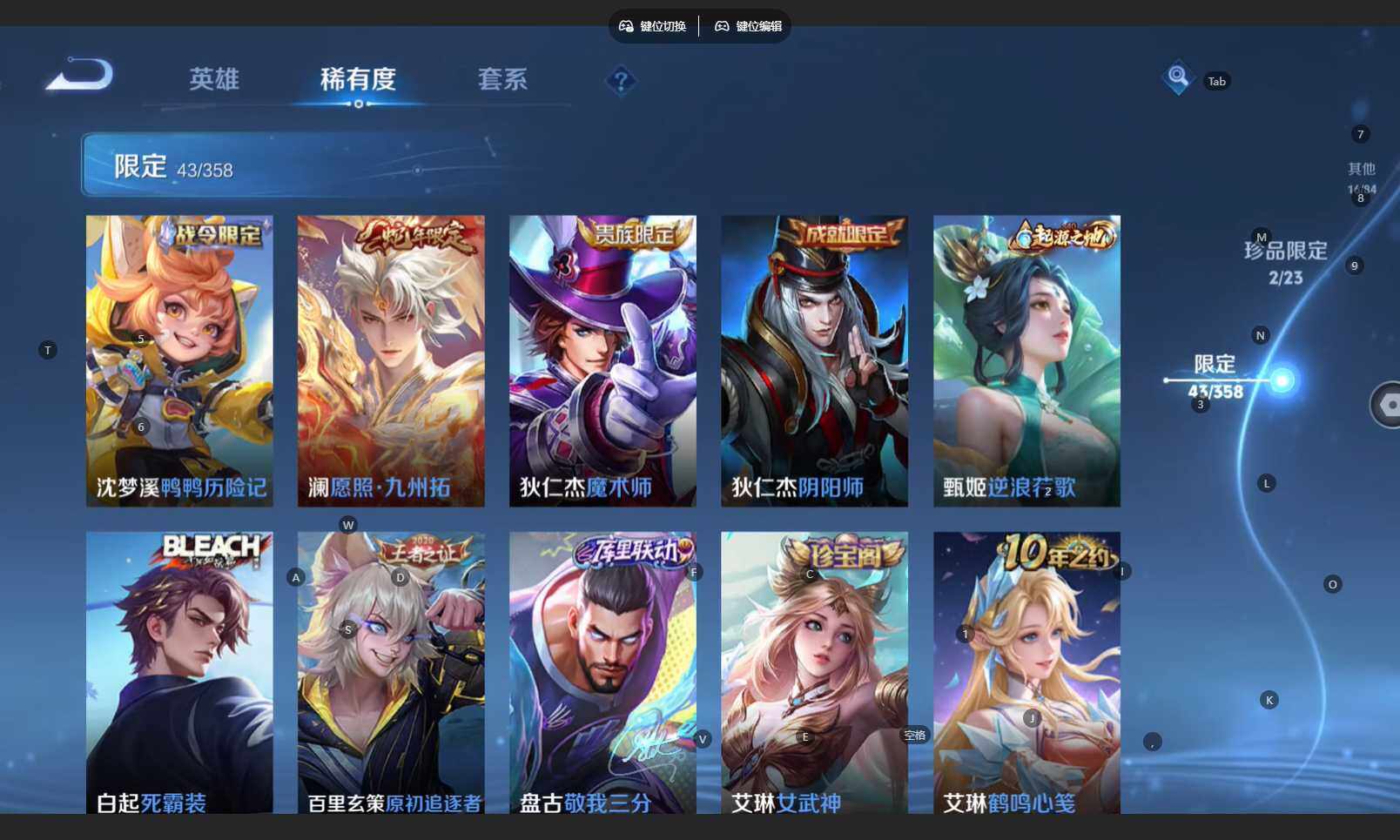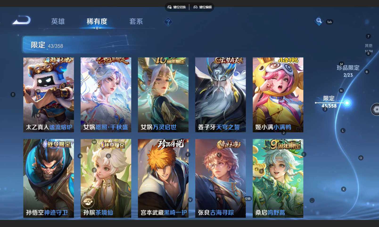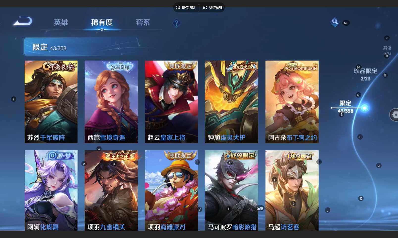 【限定皮肤】:姜子牙天穹之誓,狄仁杰阴阳师,赵云皇家上将,高渐离死亡摇滚,马可波罗暗影游猎,狄仁杰魔术师,项羽海滩派对,苏烈千军破阵,百里玄策原初追逐者,艾琳女武