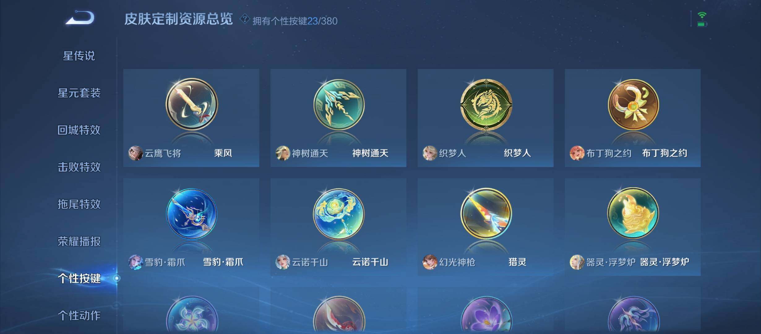 2市标,14县标,23按键,10印记【星元皮肤】:孙悟空幽冥火,宫本武藏幽冥之眼【荣耀典藏】:虞姬神鉴启示录【传说皮肤】:后羿神树通天,公孙离云诺千山,女娲愿照千秋盛,澜愿照九州拓,云缨幻光神枪,桑启鸣野蒿,澜逐花归海,露娜霜月吟,上官婉儿妄想奇谈,马可波罗妄想实况,不知火舞绯月行,公孙离祈雪灵祝,镜炽阳神光,曜云鹰飞将,刘备时之恋人,干将莫邪久胜战神,宫本武藏地狱之眼,孙悟空地狱火【限定皮肤】:蒙犽顽岩魄,蔡文姬夏日便利店,大乔绒语心约,虞姬夏日便利店,姜子牙天穹之誓,李白谪仙醉月,狄仁杰阴阳