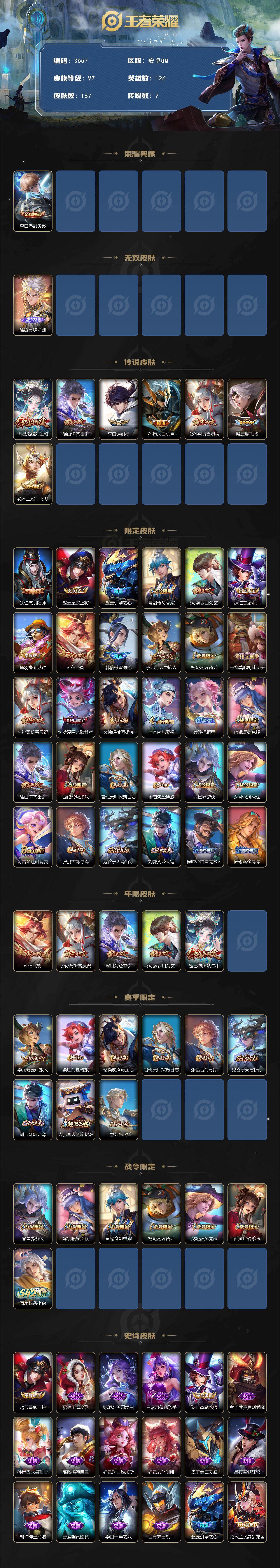 贵族7-贵族积分33945-167皮1典藏7传说1无双-1个英雄全皮 精品小打野