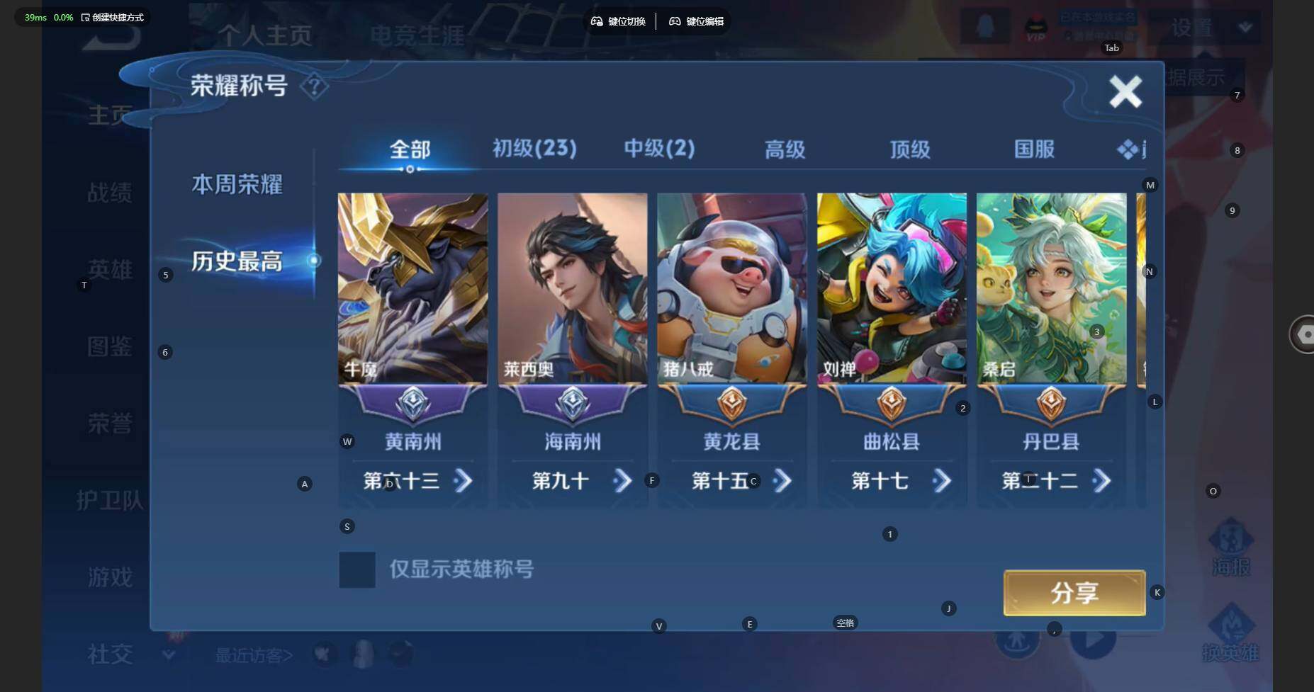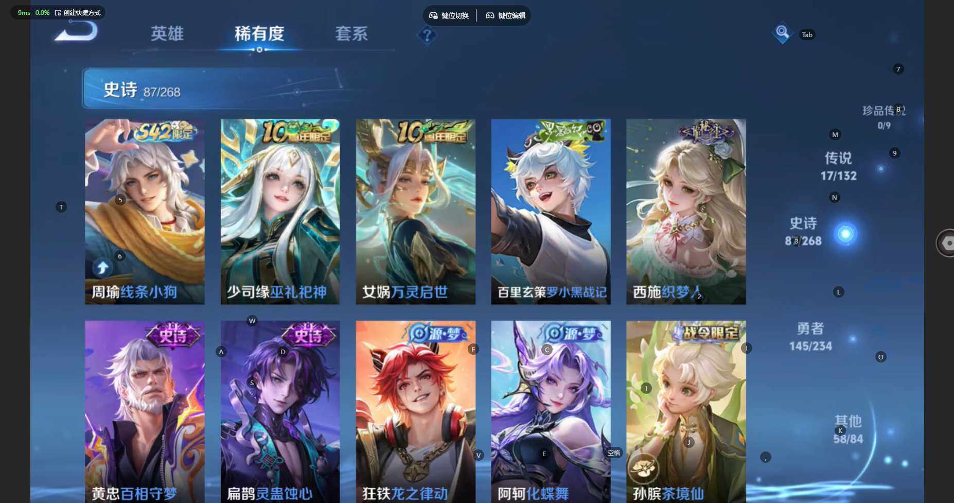 安卓Q-V7-至尊星耀IV段位-128英雄-309皮肤-2典藏皮肤-17传说-77限定-9印记-11按键