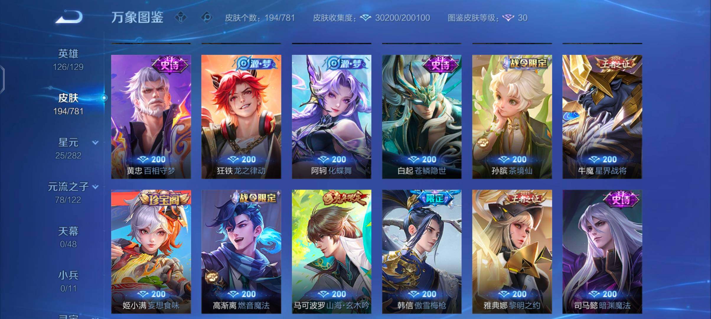 26英雄-194皮肤-7王者印记-260铭文-贵族积分2w