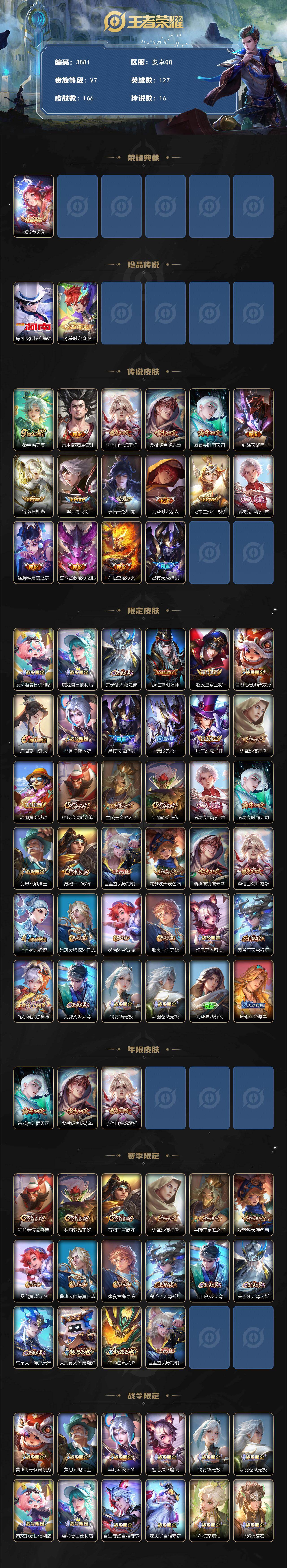 贵族7-贵族积分38155-166皮1典藏16传说0无双2珍品传说-2个英雄全皮 安卓手Q504区166皮1典藏16传说0无双2珍品传说V7
