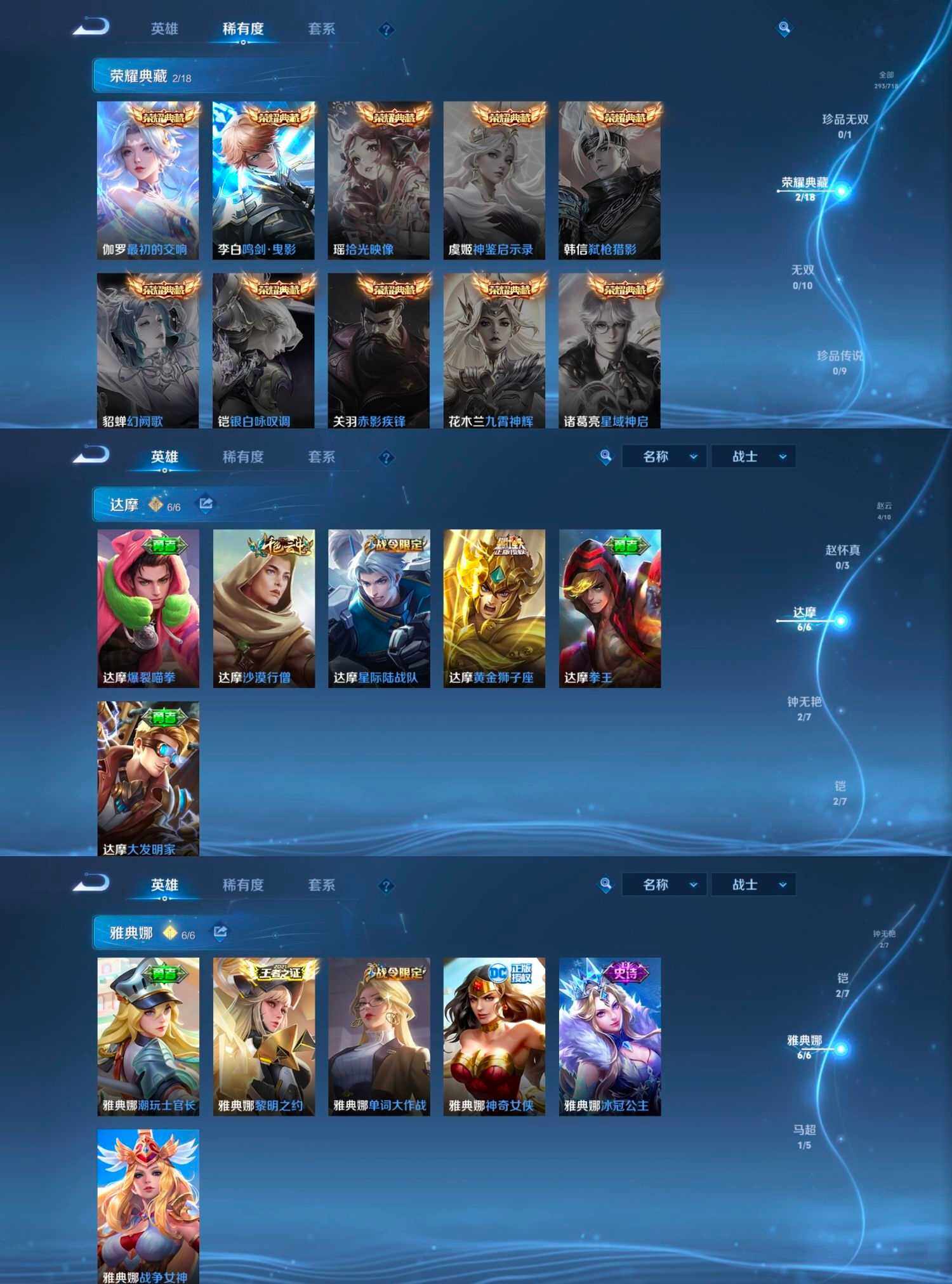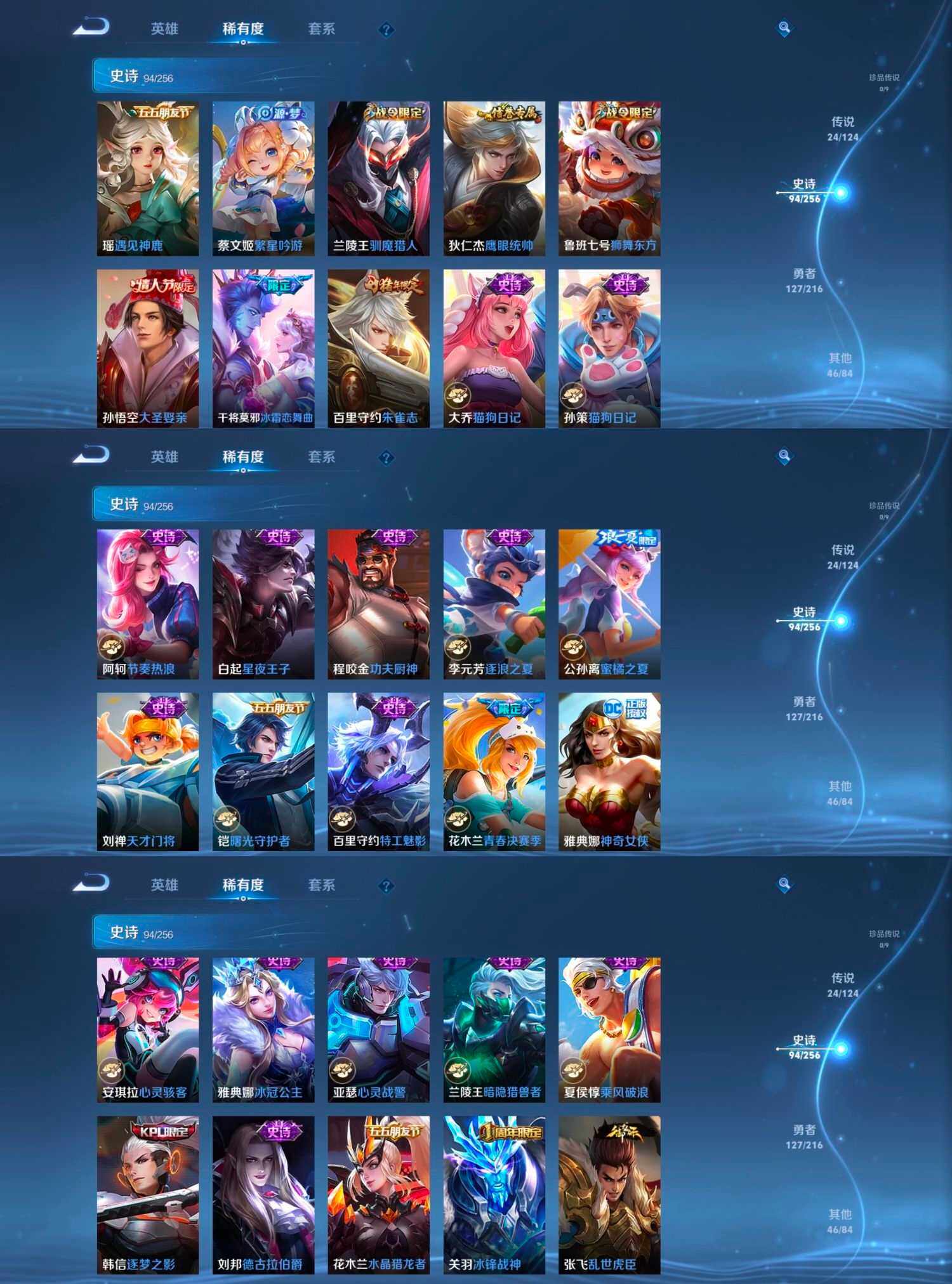 安卓Q,达摩全皮,雅典娜全皮,9县标,发育27段,15印记,宫本武藏幽冥之眼,孙尚香未来机甲,貂蝉金色仲夏夜【荣耀典藏】:李白鸣剑曳影,伽罗最初的交响【内测皮肤】:嬴政优雅恋人,艾琳女武神,狂铁特工战影【传说皮肤】:狄仁杰超时空战士,孙悟空地狱火,宫本武藏地狱之眼,孙尚香末日机甲,貂蝉仲夏夜之梦,后羿黄金射手座,花木兰冠军飞将,达摩黄金狮子座,干将莫邪久胜战神,张良黄金白羊座,李信一念神魔,曜云鹰飞将,孙悟空零号赤焰,虞姬启明星使,铠绛天战甲,诸葛亮时雨天司,小乔音你心动,周瑜音你心动,赵云淬星