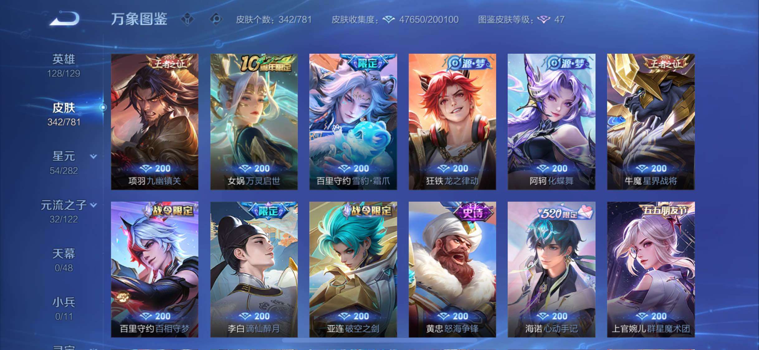 128英雄-342皮肤-9王者印记-300铭文-贵族积分8w