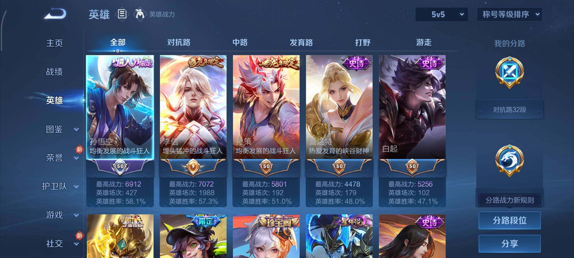 128英雄-233皮肤-15王者印记-180铭文-贵族积分7w