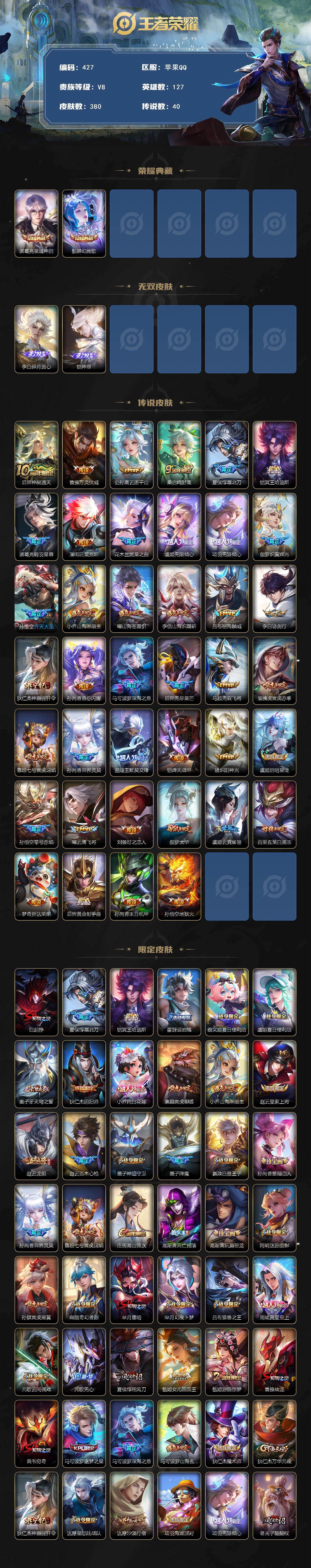 苹果Q-V8-127英雄-380皮肤-2典藏皮肤-2无双-40传说-128史诗【