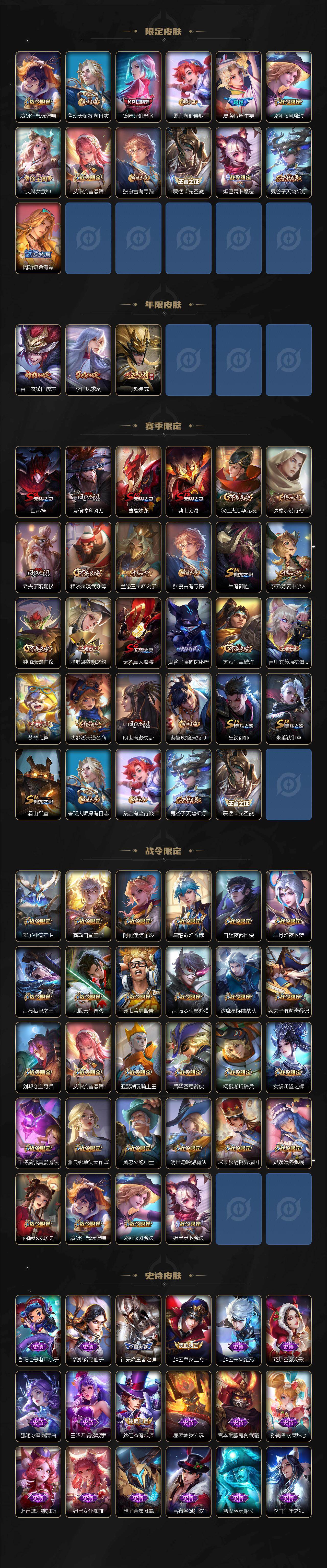 【传说皮肤】:典韦战鼓燎原,诸葛亮鹤羽星尊,张飞百相守梦,夏洛特浮生妄,李白诗剑行,马超无双飞将,赵云淬星耀世,西施游龙清影,镜炽阳神光,虞姬启明星使,孙悟空零号赤焰,百里玄策白虎志,李白凤求凰,孙尚香末日机甲,狄仁杰超时空战士