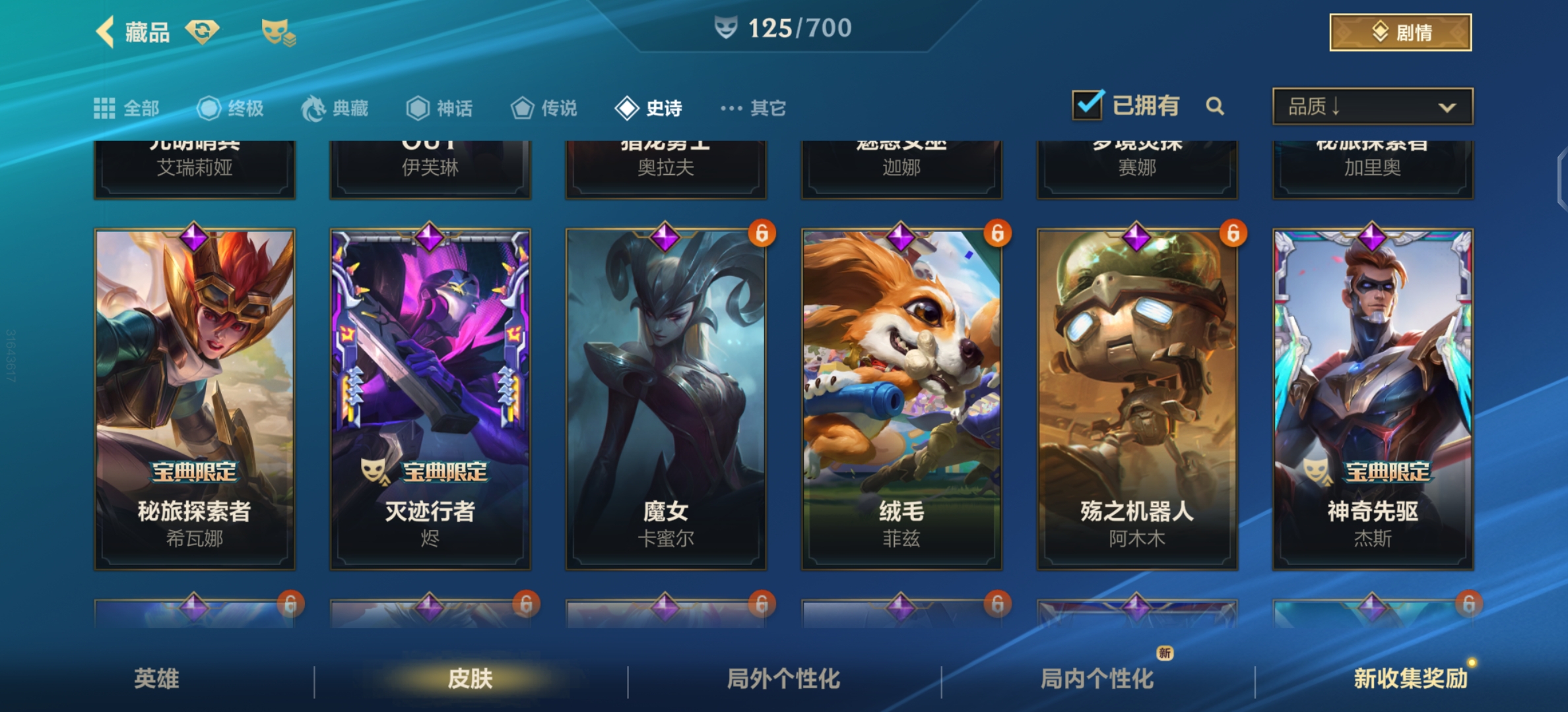 【史诗皮肤】:钢铁军团 盖伦,腥红之月 亚托克斯,战斗学院 拉克丝,殇之机器人 阿木木,星域先知 卡尔玛,地狱行者 孙悟空,暗星 奥莉安娜,泳池派对 奥莉安娜,恶魔之刃 泰达米尔,暗星 卡兹克,灭迹行者 烬,弹幕天使 卡莎,K/DA ALL OUT 伊芙琳,福牛守护者 菲奥娜,