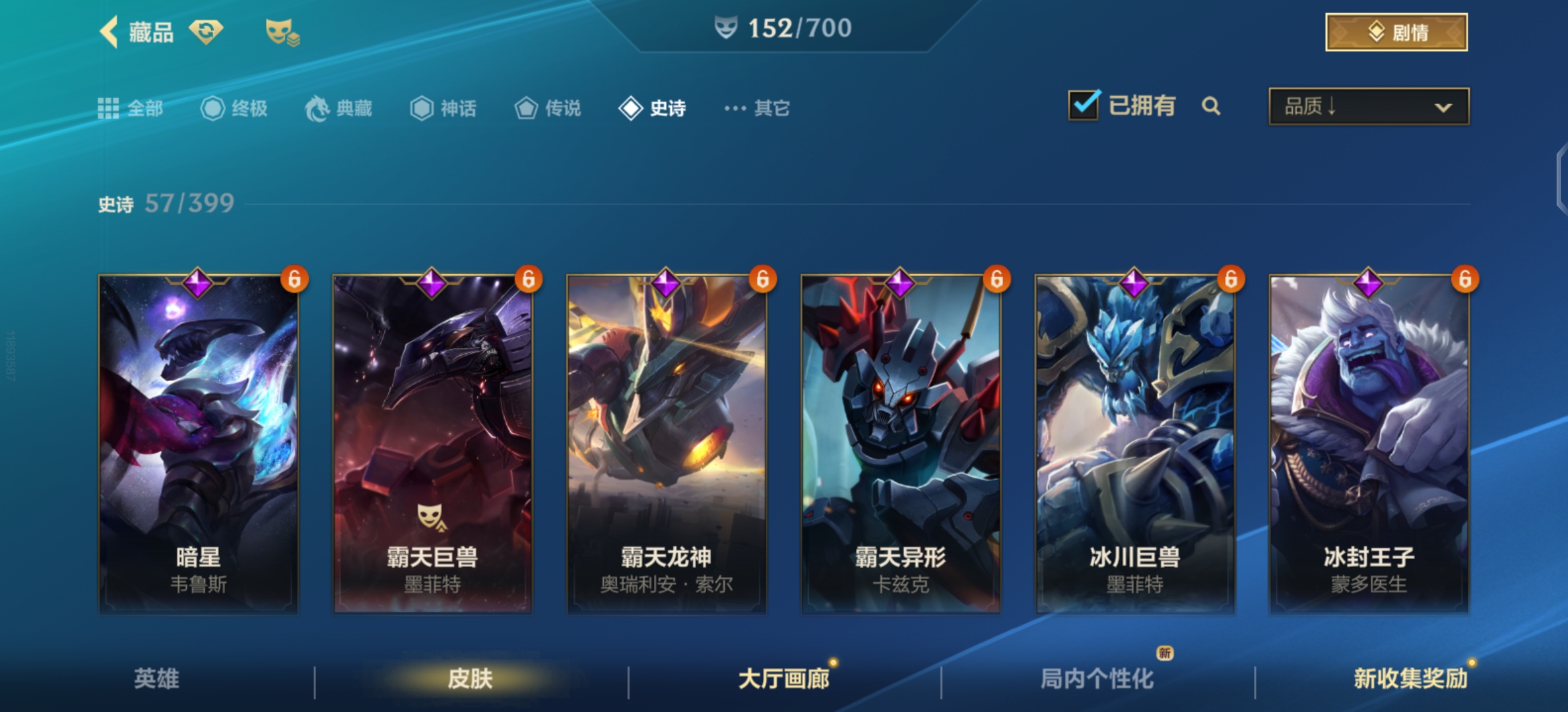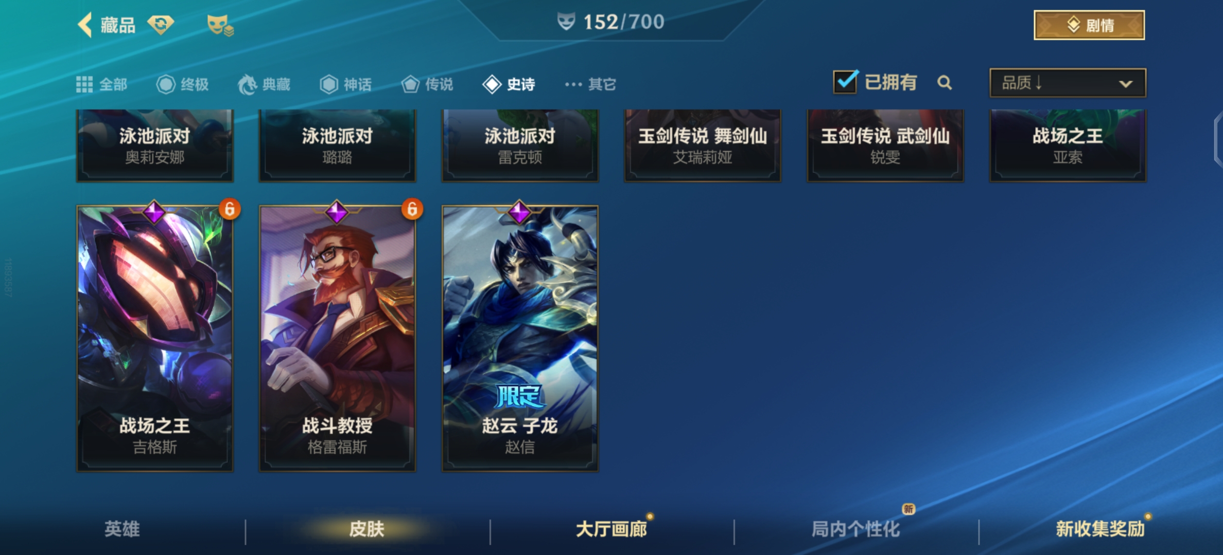 【史诗皮肤】:腥红之月 亚托克斯,星域先知 卡尔玛,地狱行者 孙悟空,探梦奇旅 艾克,泳池派对 奥莉安娜,赵云 子龙 赵信,猎龙勇士 赵信,霸天异形 卡兹