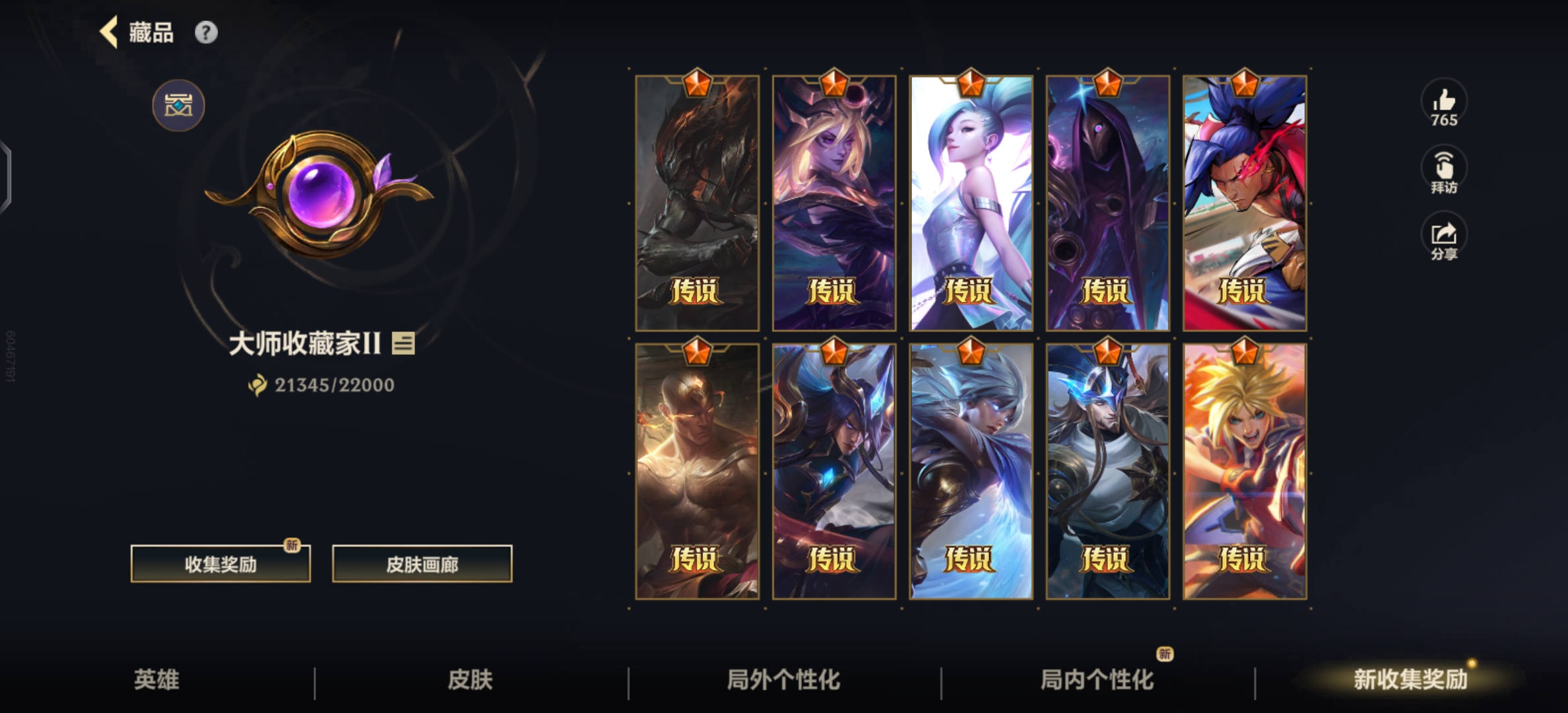 【传说皮肤】:暗星女王 拉克丝,光明哨兵 薇恩,暗星尊 烬,星域游侠 崔斯特,K/DA ALL OUT 萨勒芬妮,黑夜使者 亚索,斗魂无双 亚索,天煞 劫,西部魔影 卢锡安,神拳 李青,律政大亨 蒙多医生,炼狱魔犬 内瑟斯,黎明使者 永恩,灌篮高手 德莱厄斯,黎明使者 锐雯,战斗学院 伊泽瑞尔,地狱之门卫士 加里奥,源计划:泯灭 雷克顿
