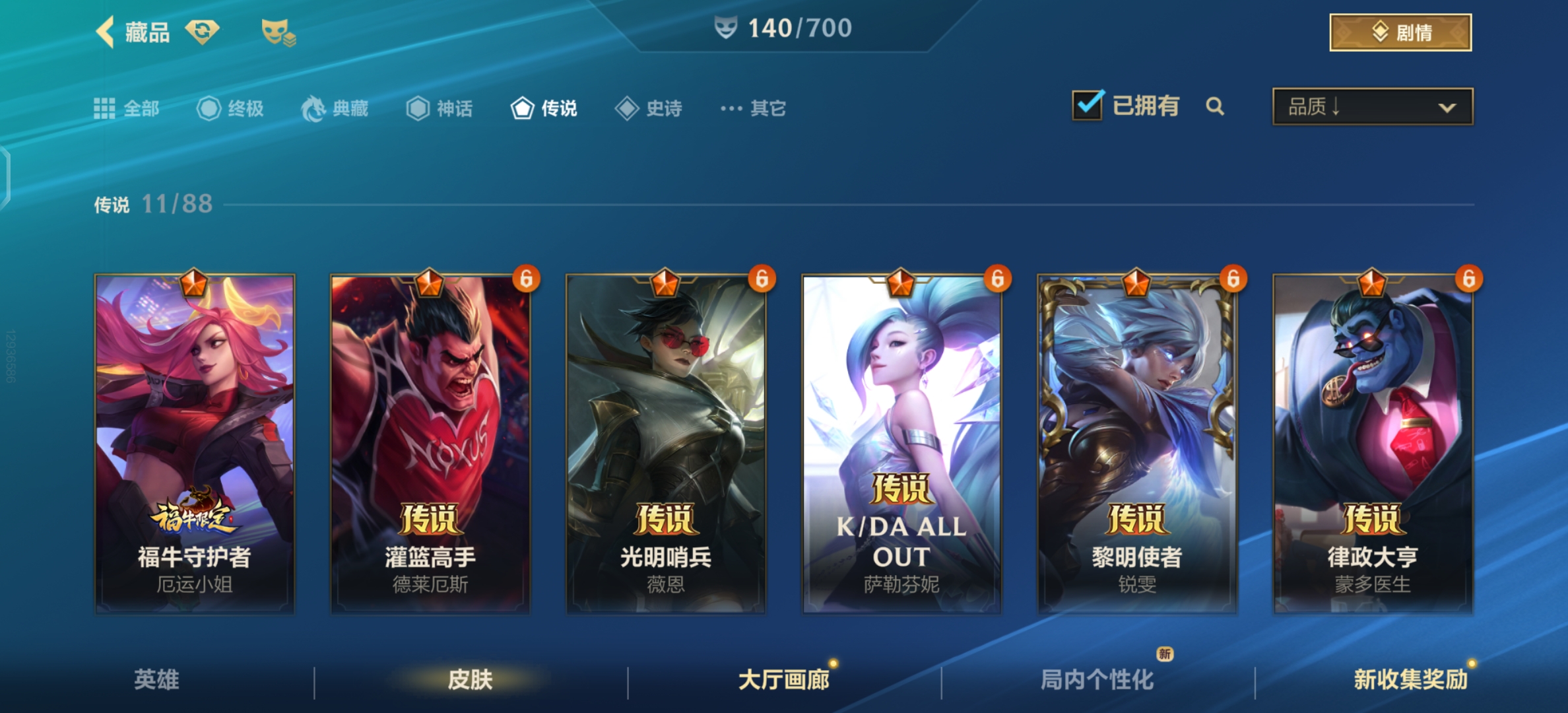 【传说皮肤】:源计划:净化 薇恩,光明哨兵 薇恩,K/DA ALL OUT 萨勒芬妮,西部魔影 卢锡安,欧米伽小队 幽灵特工 提莫,律政大亨 蒙多医生,福牛守护者 厄运小姐,灌篮高手 德莱厄斯,神王 德莱厄斯,黎明使者 锐雯,西部天使 赛娜