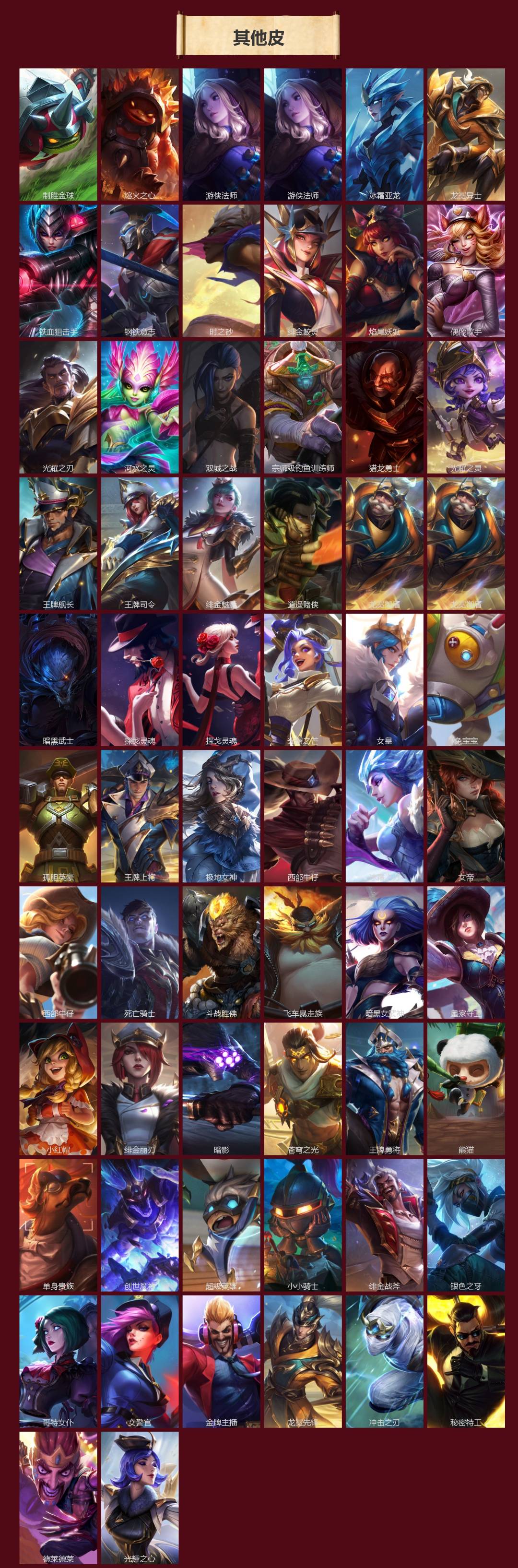 【传说皮】暗星尊,西部天使赛娜,西部天使寒冰,西部魔影卢锡安,天煞劫,神王诺手,神王盖伦,神拳盲僧,神龙尊者 驭风啸龙,律政大亨,炼狱魔犬,黎明使者锐雯,黑夜使者亚索,光明哨兵薇恩,灌篮高手,星域游侠卡牌,星之守护者阿狸,黎明使者永恩,暗星女王拉克丝,源计划:泯灭,源计划:林,剪胜裁春格温,星之守护者 落