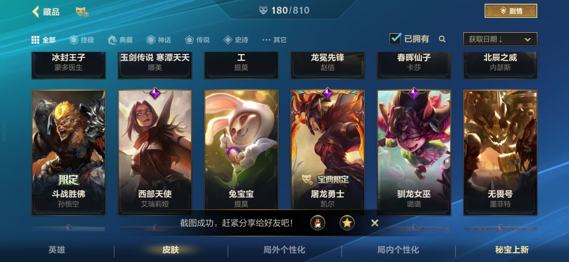[16734704]1神话 1限定 21传说 180皮肤 可二次 可修改实名