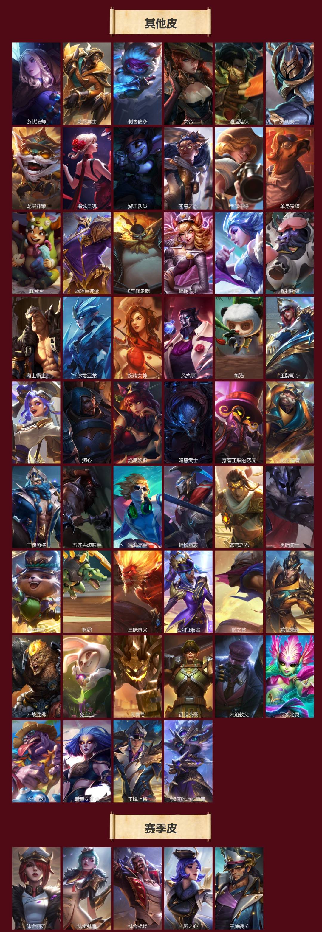 【传说皮】神龙尊者 圣龙 李青,心之钢凯隐,灵魂莲华腕豪,北极星神 黛安娜,地狱之门卫士,西部天使寒冰,西部魔影卢锡安,天煞劫,神王诺手,神王盖伦,日蚀骑士蕾欧娜,星之守护者金克丝,欧米伽小队 幽灵特工,律政大亨,灌篮高手,星域游侠卡牌,暗星女王拉克丝,源计划:泯灭,月蚀骑士蕾欧娜,星之守护者 陨,星之守护者 落