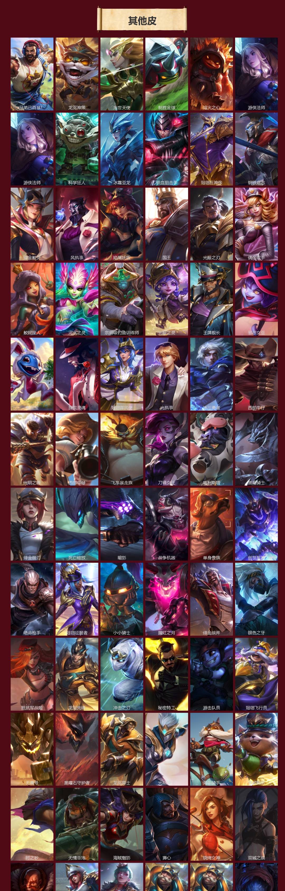 【传说皮】神王诺手,神王盖伦,神龙尊者 驭风啸龙,星之守护者金克丝,黑夜使者亚索,福牛守护者女枪,太空律动机器人,最终BOSS维迦,灵魂莲华锤石,月蚀骑士蕾欧娜