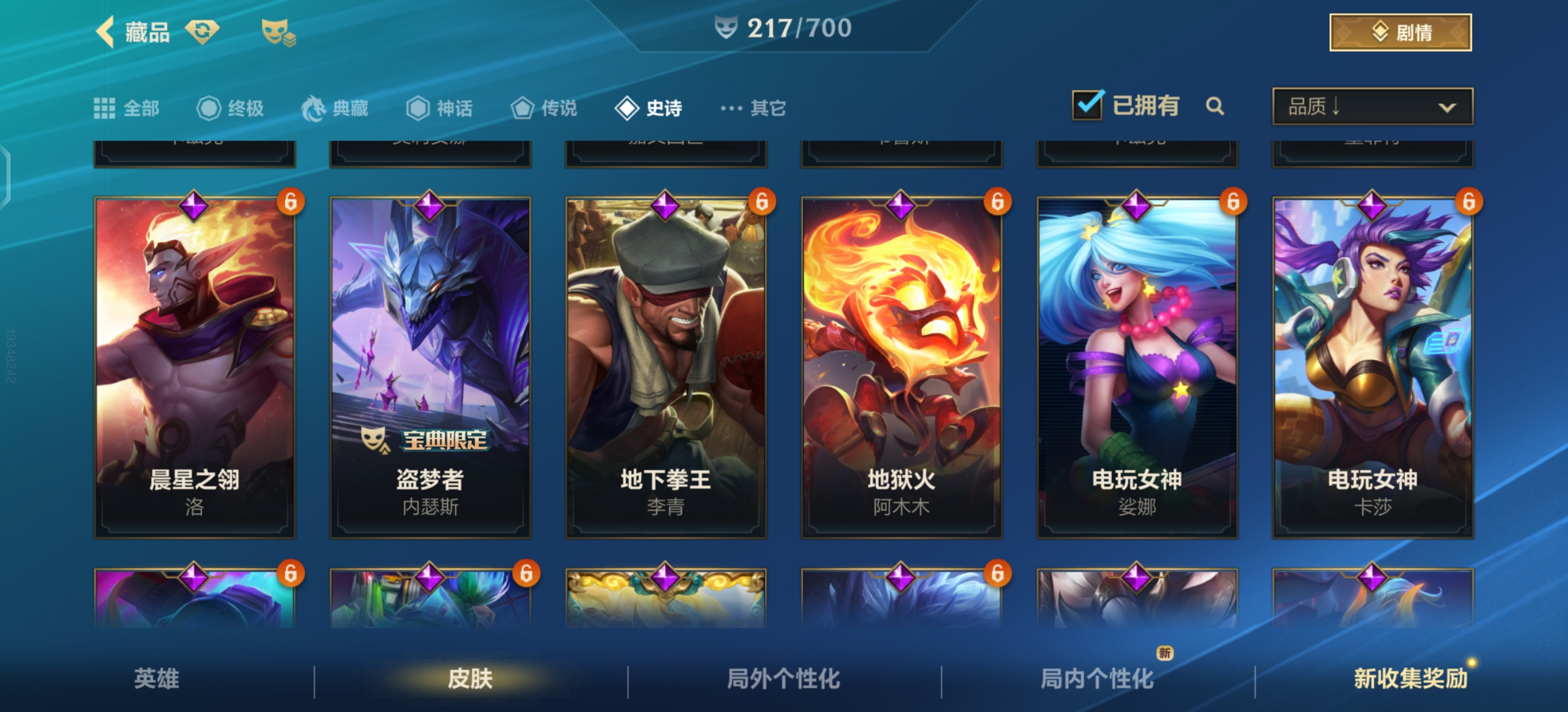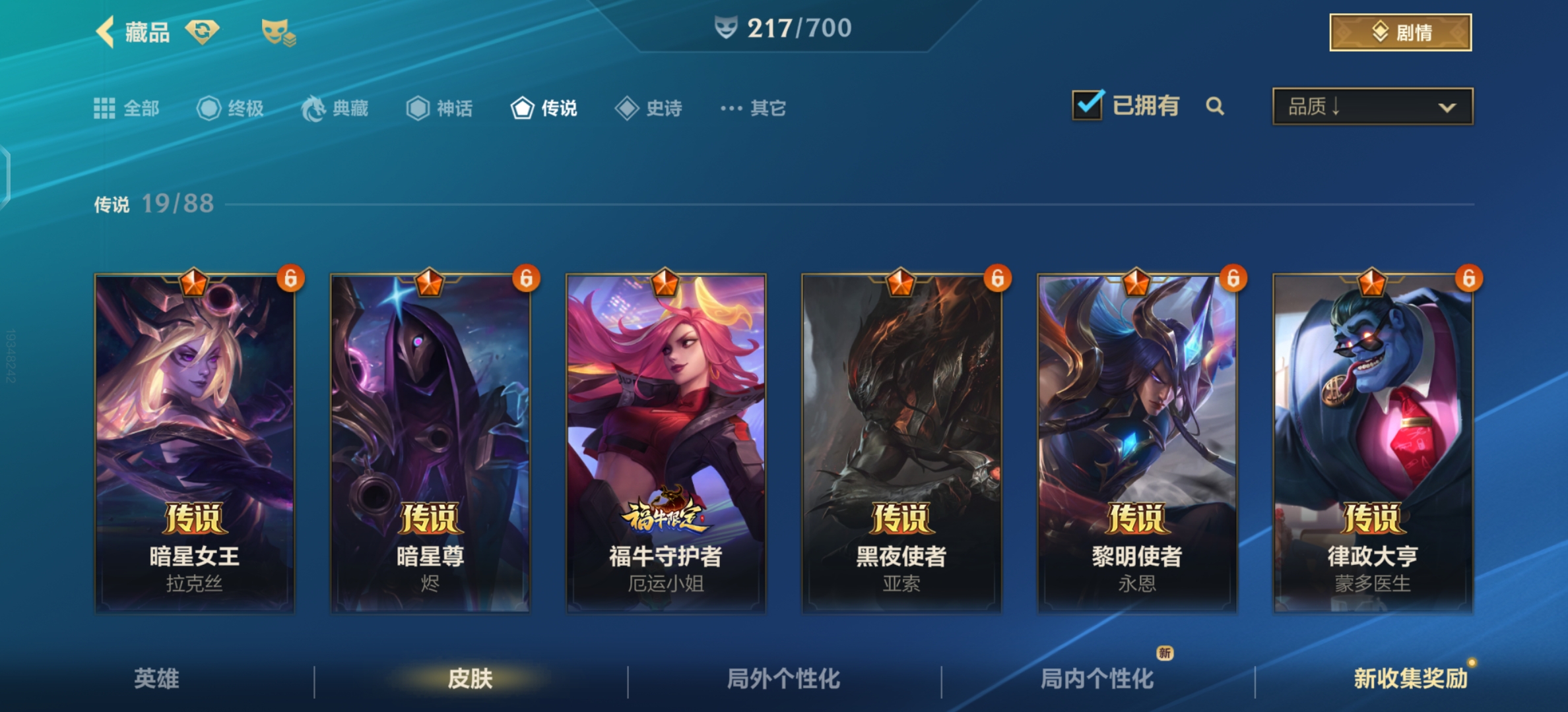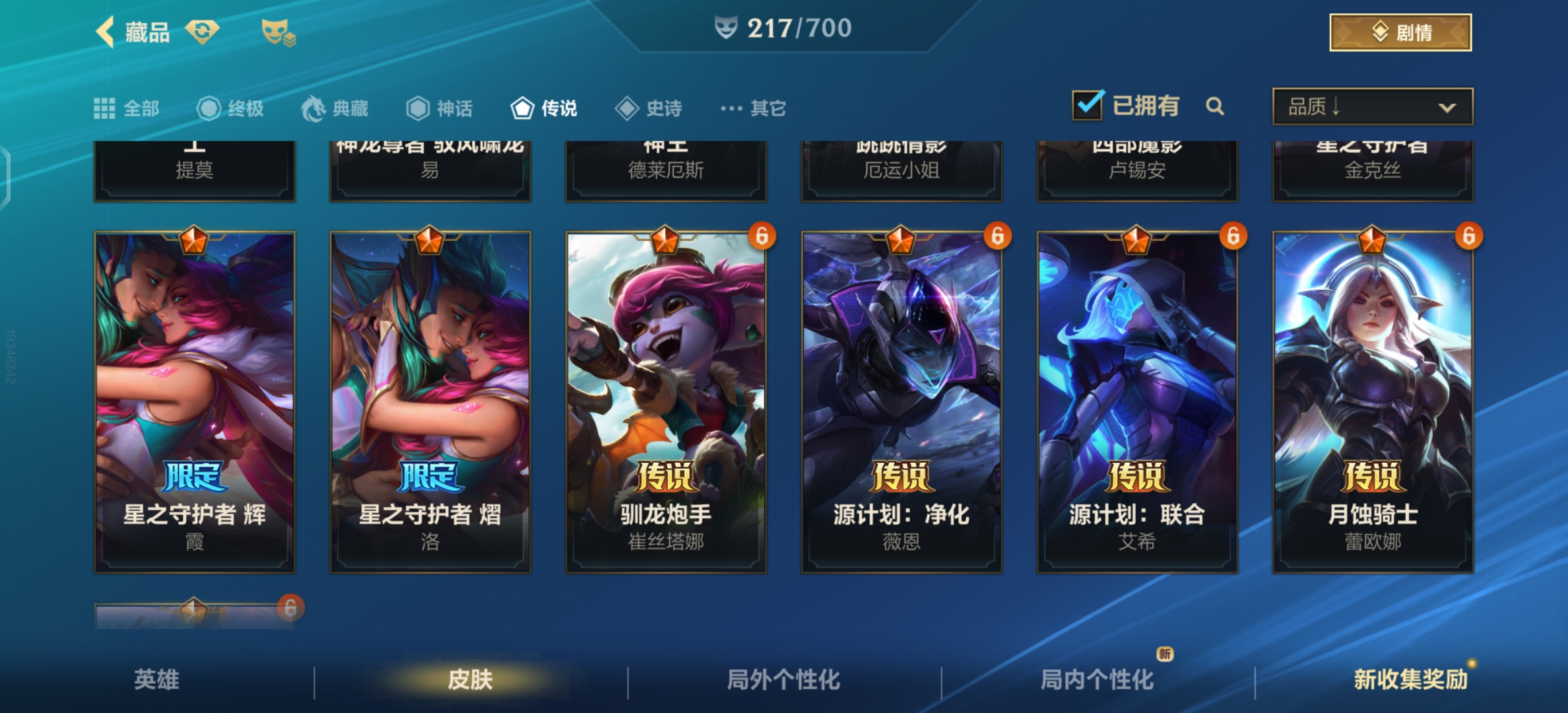 【传说皮肤】:星之守护者 金克丝,暗星尊 烬,黑夜使者 亚索,星之守护者 阿狸,天煞 劫,西部魔影 卢锡安,律政大亨 蒙多医生,福牛守护者 厄运小姐,神龙尊者 驭风啸龙 易,神王 德莱厄斯,黎明使者 锐雯,战斗学院 伊泽瑞尔