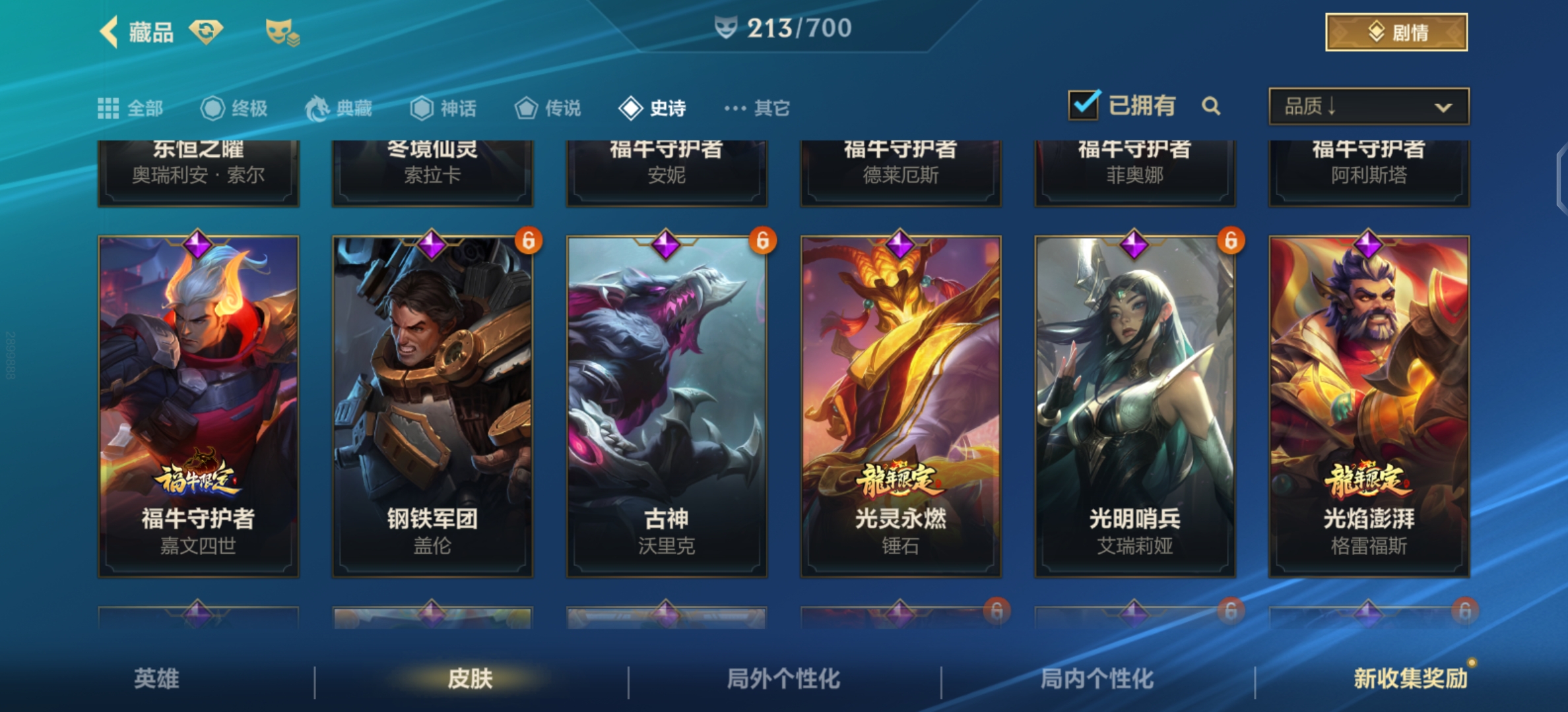 【传说皮肤】:光影巨翼 亚托克斯,星之守护者 金克丝,星域游侠 崔斯特,黑夜使者 亚索,星之守护者 阿狸,西部魔影 卢锡安,星之守护者 辉 霞,星之守护者 陨 洛,神拳 李青,福牛守护者 厄运小姐,光电璀璨 泽丽,灌篮高手 德莱厄斯,源计划:联合 艾希,战斗学院 伊泽瑞尔,地狱之门卫士 加里奥