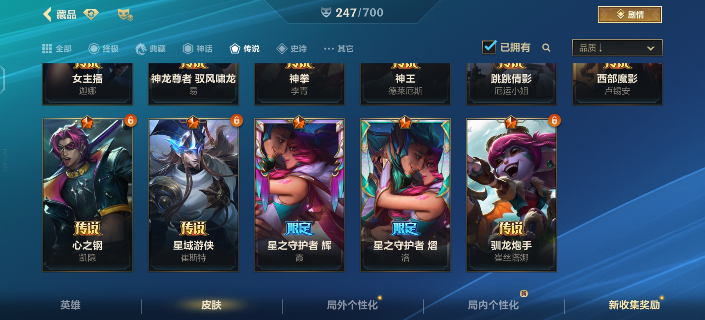 【传说皮肤】:心之钢 凯隐,星域游侠 崔斯特,黑夜使者 亚索,西部魔影 卢锡安,驯龙炮手 崔丝塔娜,星之守护者 辉 霞,星之守护者 熠 洛,神拳 李青,福牛守护者 厄运小姐,跳跳倩影 厄运小姐,黎明使者 永恩,神龙尊者 驭风啸龙 易,神王 德莱厄斯,女主播 迦娜,黎