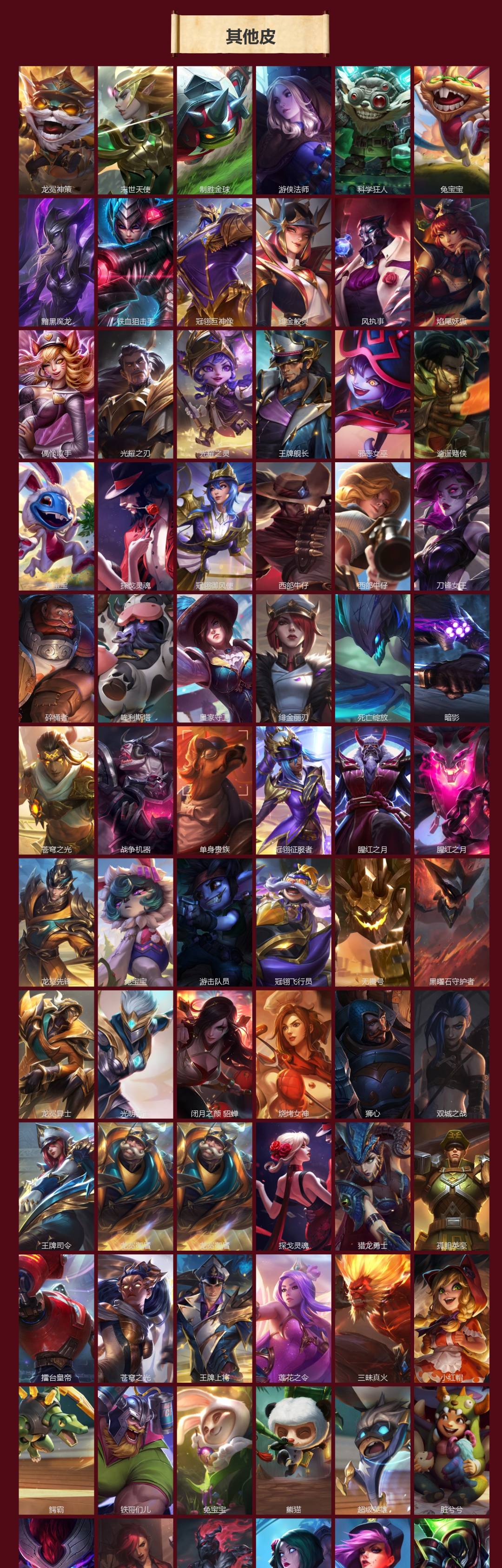 【传说皮】碧空长歌 萨勒芬妮,驯龙学者 黑默丁格,星之守护者 阿卡丽,至尊魔女 莫甘娜,花车开起来咯 墨菲特,源计划:毁灭,灵魂莲华腕豪,北极星神 黛安娜,青花瓷 奥瑞利安·索尔,斗魂无双 卢锡安,神龙尊者 昼日