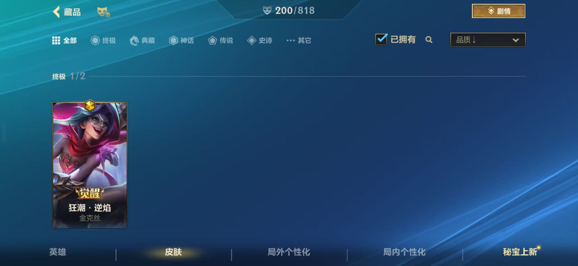 【传说皮】暗星尊,海魔至尊 亚托克斯,水晶玫瑰 卡莎,神龙尊者 圣龙 李青,斗魂觉醒 莎弥拉,灵魂莲华阿狸,星之守护者卡莎,地狱之门卫士,西部天使赛娜,西部天使寒冰,西部魔影卢锡安,天煞劫,神王盖伦,神拳盲僧,星之守护者金克丝,女主播风女,炼狱魔犬,光明