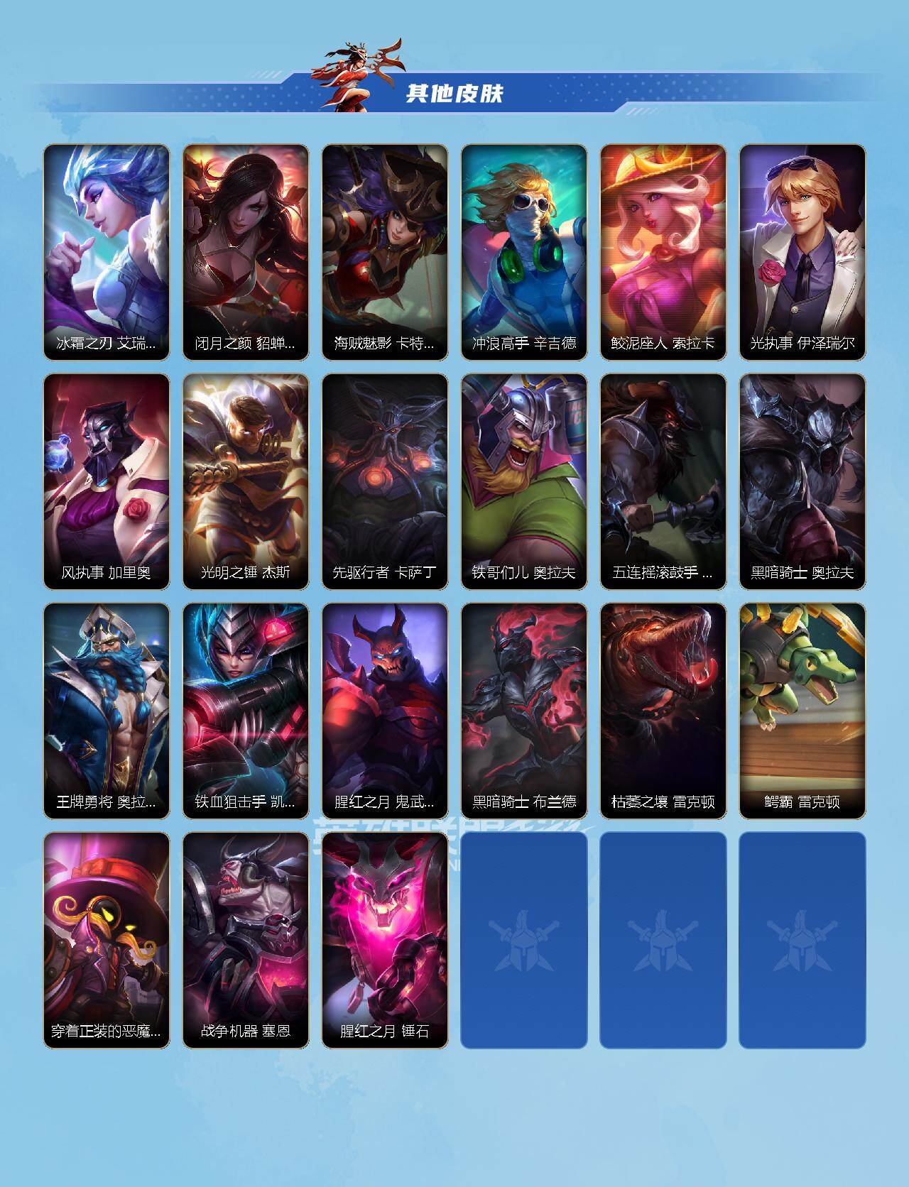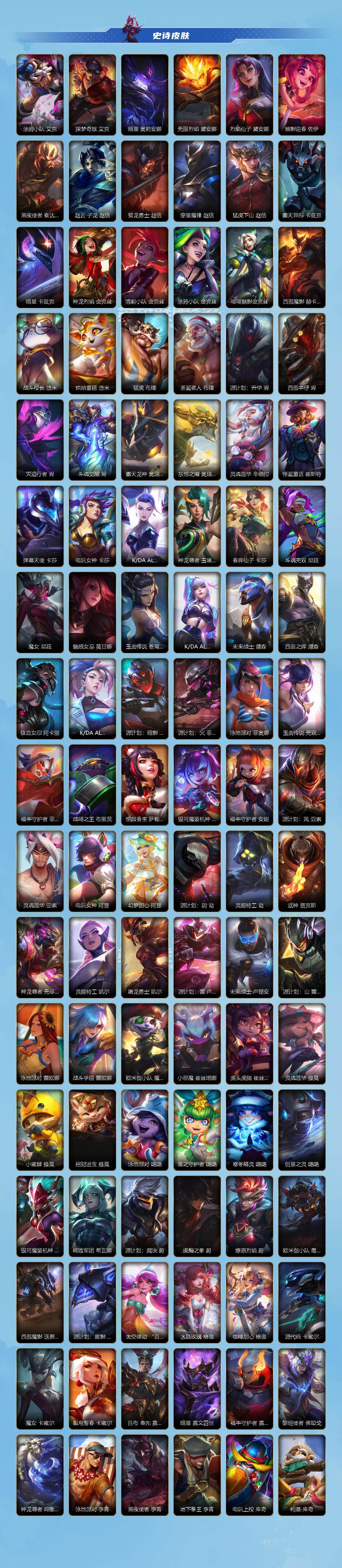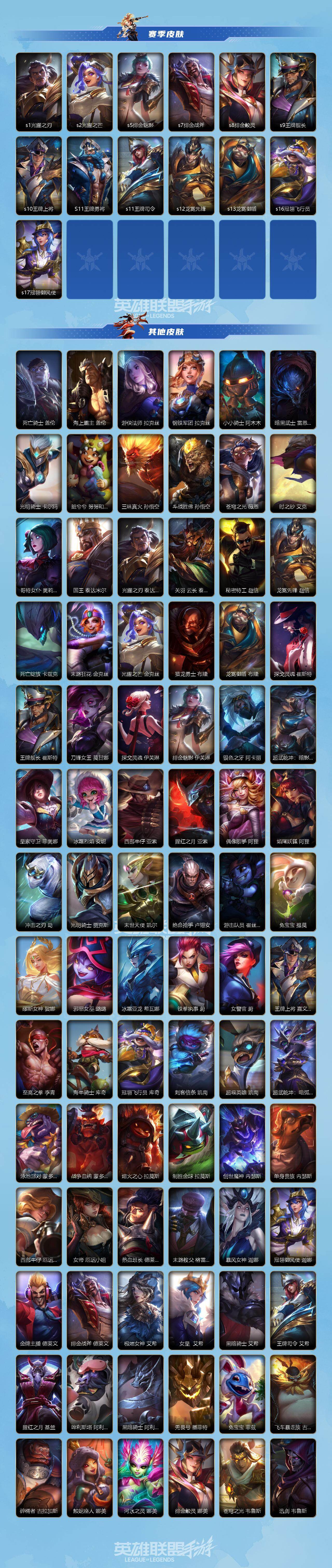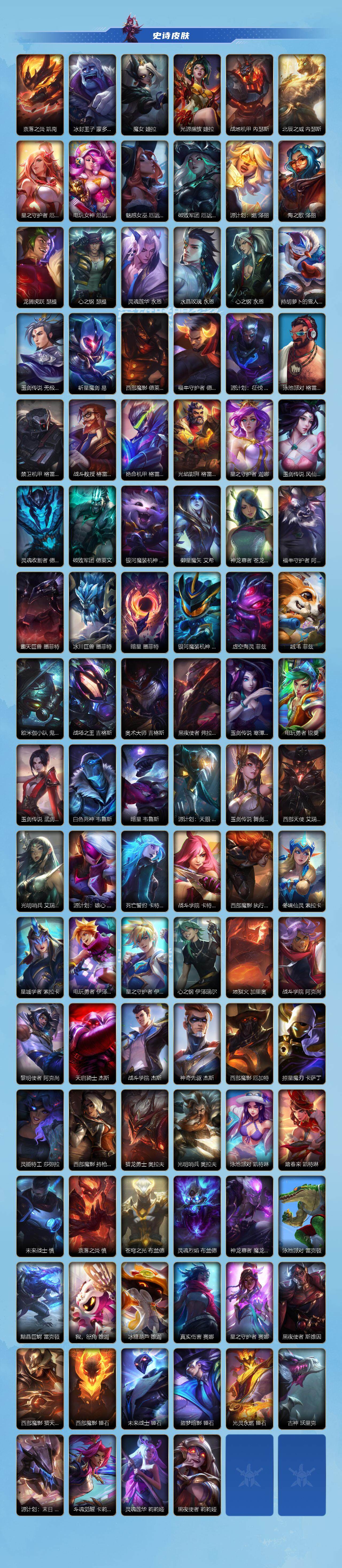 【限定皮肤】:穿星魔锋 赵信,创星之灵 璐璐,掠星魔刃 卡萨丁,御星魔矢 艾希,斩星魔剑 易,钢铁军团 拉克丝,赵云 子龙 赵信,烈焰美人 薇恩,神龙烈焰 金克丝,虎痴之拳 蔚,闭月之颜 貂蝉 卡特琳娜,张辽 文远 盖伦,美猴王 孙悟空,水晶玫瑰 永恩,关羽 云长 泰达米尔,涂鸦小队 莎弥拉,涂鸦小