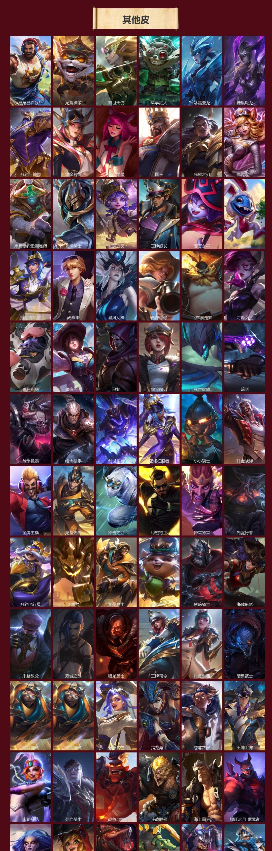 【传说皮】御风墨影 亚索,海魔至尊 亚托克斯,魄炼九幽 派克,花车开起来咯 墨菲特,神龙尊者 圣龙 李青,淳和墨意 嘉文四世,光影巨翼亚托克斯,源计划:毁灭,心之钢凯隐,灵魂莲华阿狸,灵魂莲华腕豪,地狱之门卫士,西部天使赛娜,西部天使寒冰,西部魔影卢锡安,天煞劫