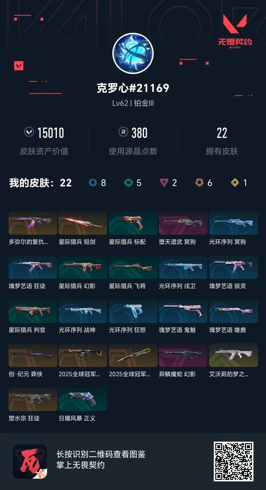 [16730752]6橙皮 1金皮 2紫皮 22皮肤 14英雄 47卡面 380已用源晶 铂金段位
