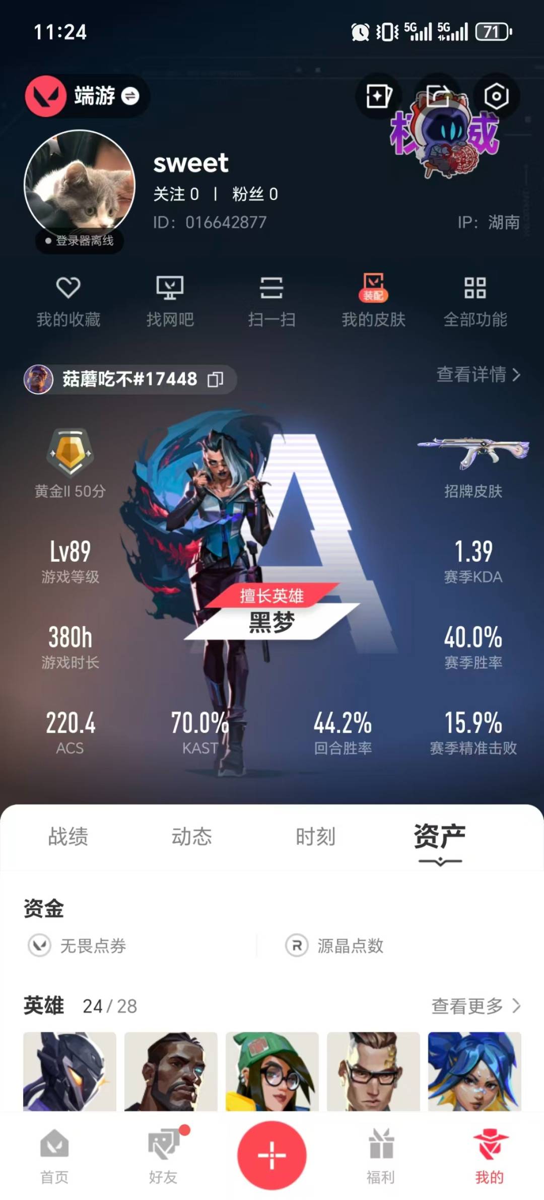 [16975002]5橙皮 1金皮 2紫皮 35皮肤 24英雄 70卡面 410已用源晶 黄金段位