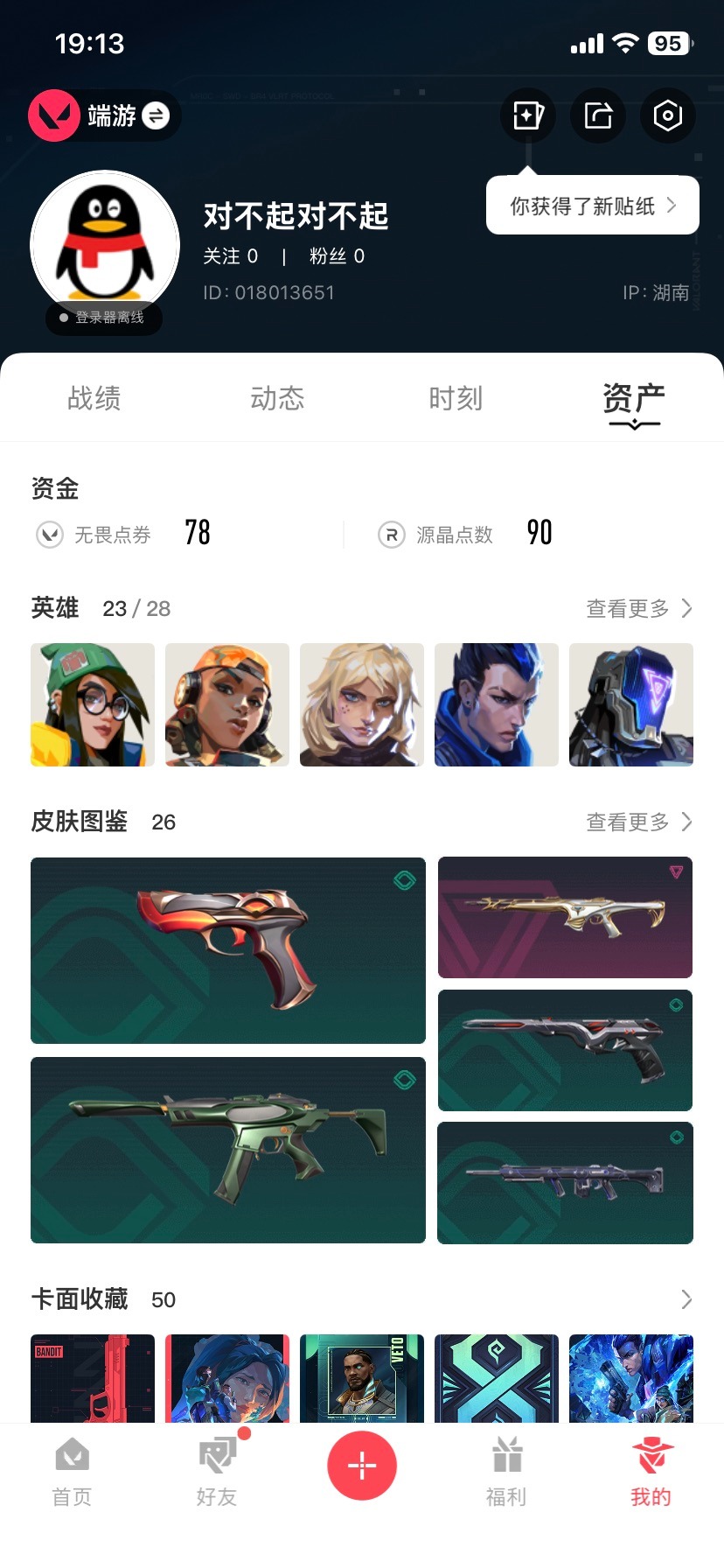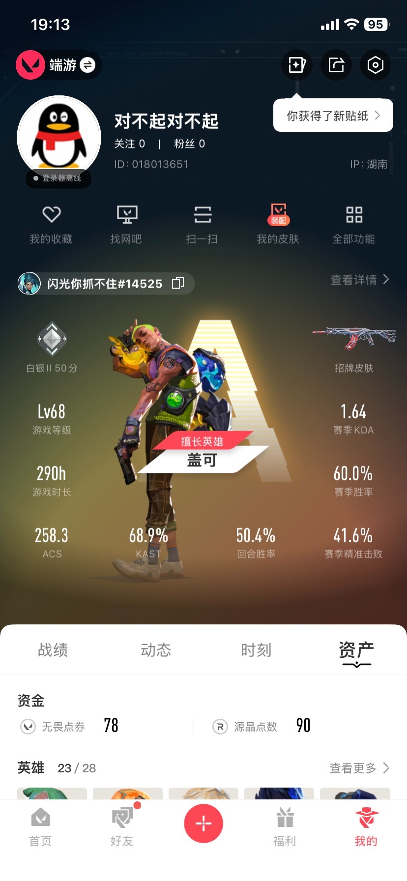 [16725366]8橙皮 3紫皮 26皮肤 23英雄 50卡面 445已用源晶 白银段位